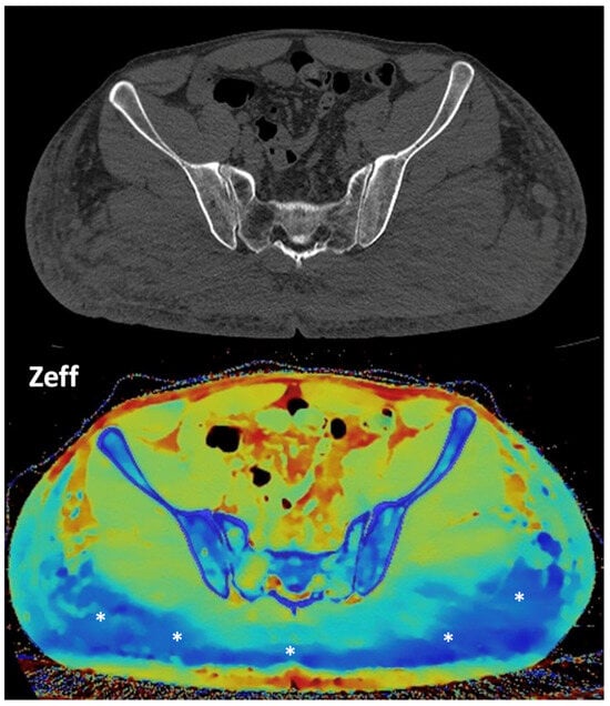 Figure 16. Gluteal silicone injection. Unenhanced CT image (top) shows a diffuse increase in density in both gluteal areas. Silicone deposition is better evaluated in a Zeff map (bottom), which separates silicone (blue areas, asterisks) from edema based on their different atomic numbers (silicon Z = 14).
