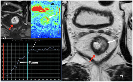 Rectal cancer following total neoadjuvant therapy. Screen capture of MRI sequences (a) including dynamic contrast-enhanced (+C) exam, area-under-the-curve (AUC) parametric map, time–intensity curve, and axial T2-weighted images demonstrates a residual lesion in the rectum (red arrow) with markedly hypointensity on T2 and with a type 1 curve of progressive enhancement suggesting fibrosis. Note secondary inflammatory changes (white arrows) with wall thickening on the left side of the rectum on T2 and increased signal on the AUC parametric map. DECT imaging (b) shows increased iodine uptake within the lesion (iodine concentration: 1.85 mg/mL). While DCE-MRI offers a dynamic assessment of tumor enhancement, iodine quantification is not a dynamic parameter, and only represents the amount of iodine contrast within an object in a concrete timing.