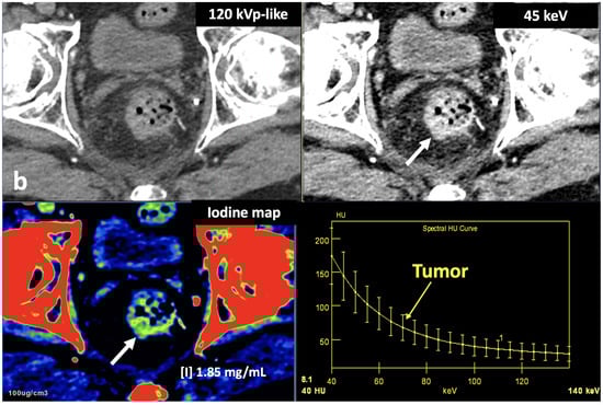 - Fan, S.; Li, X.; Zheng, L.; Hu, D.; Ren, X.; Ye, Z. Correlations between the iodine concentrations from dual energy computed to-mography and molecular markers Ki-67 and HIF-1α in rectal cancer: A preliminary study. Eur. J. Radiol. 2017, 96, 109–114. [Google Scholar] [CrossRef]
