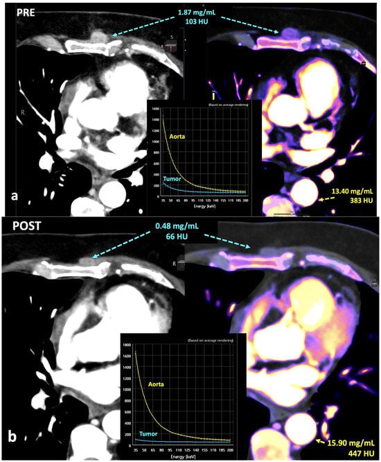 Breast cancer recurrence treated with hormotherapy and kinase inhibitors evaluated with DECT pre- (a) and post-therapy (b). A decrease in density and iodine concentration in the lesion is evident following therapy (b). Also note the different density and iodine concentration of the aorta in both studies, a difference in enhancement that in many cases might alter the degree of significance of the changes seen in the lesion.