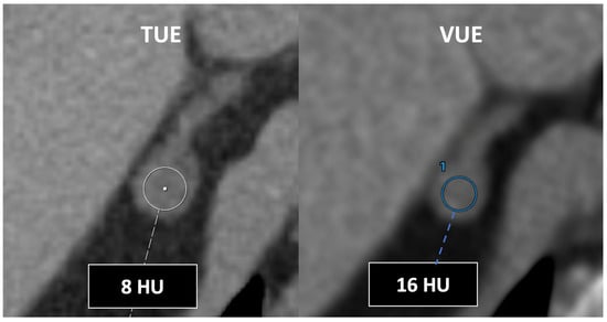 Sixth, DECT enables computational removal of iodine content from CT images, generating VUE images. However, the algorithms used are not perfect. Attenuation measurements in VUE images may be higher than those calculated in true unenhanced acquisitions (TUEs) (especially in the case of fat with differences >10 UH) and non-reproductible among scanners (Figure 21). These differences between virtual unenhanced and true unenhanced attenuation values could be problematic in the case of adrenal lesions, limiting the adoption of the usual 10 HU threshold for characterization purposes [20,21]. Moreover, incomplete iodine removal in cases of very high iodine concentration may result in false positive findings suggesting malignancy [9,10,11]. Finally, iodine subtraction algorithms are prone to inadvertent subtraction of materials with a high Z-value like calcium. Calcifications and the size of calcifications tend to be underestimated in VUE images. This feature can reduce conspicuity of calcification in the pancreatic parenchyma in cases of chronic pancreatitis or in renal masses, affecting lesion interpretation.