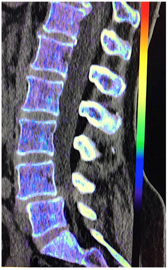 Figure 22. Virtual non-calcium (VNC) imaging allows the assessment of bone marrow. However, in cases of infiltrative tumors with low tumor burden, it may fail to depict bone marrow involvement. Color-coded VNC imaging of the lumbar spine was normal in a patient with a low level of infiltration by myeloma. - DECT-derived fat fraction, a quantitative marker of fat content in the liver, correlates with histopathological examination, the reference standard for steatosis. Pathology assessment is based on the fraction of hepatocytes containing fatty vesicles: grade 0 (healthy, <5%), grade 1 (mild, 5–33%), grade 2 (moderate, 34–66%), and grade 3 (severe, >66%), while DECT evidences a substantially lower fatty liver content due to the simultaneous presence of fat, water, and soft tissue in the voxel. Pathologic data can be correlated with DECT-derived fat quantification and a conversion factor may aid in the prediction of the histopathological fat fraction based on fat quantification using DECT [30]. Patients with co-existing hepatic fat and iron overload represent a clinical challenge. In the presence of multiple material elements in the same voxel, it is still not clear whether the presence of fat and iron in the same voxel results in reduced performance of DECT [27].
