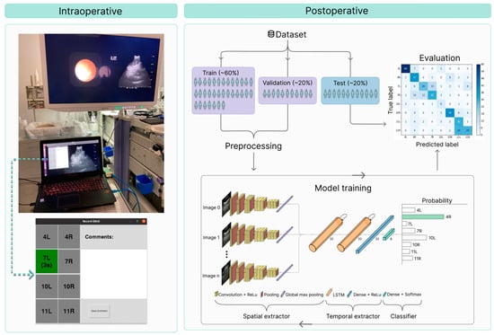 EBUS-TBNA was performed according to regional protocols using conscious sedation with midazolam and alfentanil. A flexible bronchoscope was first used for inspection, followed by a BF UC19OF ultrasound bronchoscope (Olympus, Tokyo, Japan) for the EBUS procedure. EBUS imaging was performed at a 10 MHz frequency and 40 mm image depth. Ultrasound videos were recorded from the EBUS processor (EU-ME2, Olympus, Tokyo, Japan) via a video grabber (AV.io, Epiphan Video, Palo Alto, CA, USA) to a laptop computer running custom software developed for this purpose. The bronchoscopist maneuvered the EBUS scope to obtain and record image sequences from lymph node stations 4L, 4R, 7L, 7R, 10L, 10R, 11L, and 11R, following the Mountain–Dresler system as specified in the 8th edition of the IASLC guidelines [7,10,11,51]. For this project, lymph node station 7 recordings were divided into 7R and 7L to distinguish imaging from the right and left sides of the main carina (Figure 1). We excluded lymph node stations 2, 5, 6, 8, and 12–14 from the study. Out of these, station 2 is the only station that can normally be accessed with the EBUS bronchoscope. However, sampling lymph nodes at this station presents technical challenges and is less likely to yield clear images and recordings. Therefore, we decided to begin with the simpler stations that are also part of the standard mapping procedures. During EBUS, the recordings were labeled with their corresponding lymph node stations on the laptop computer (Figure 2, left). All study procedures were conducted by two expert-level bronchoscopists, who had performed more than 500 EBUS procedures each.