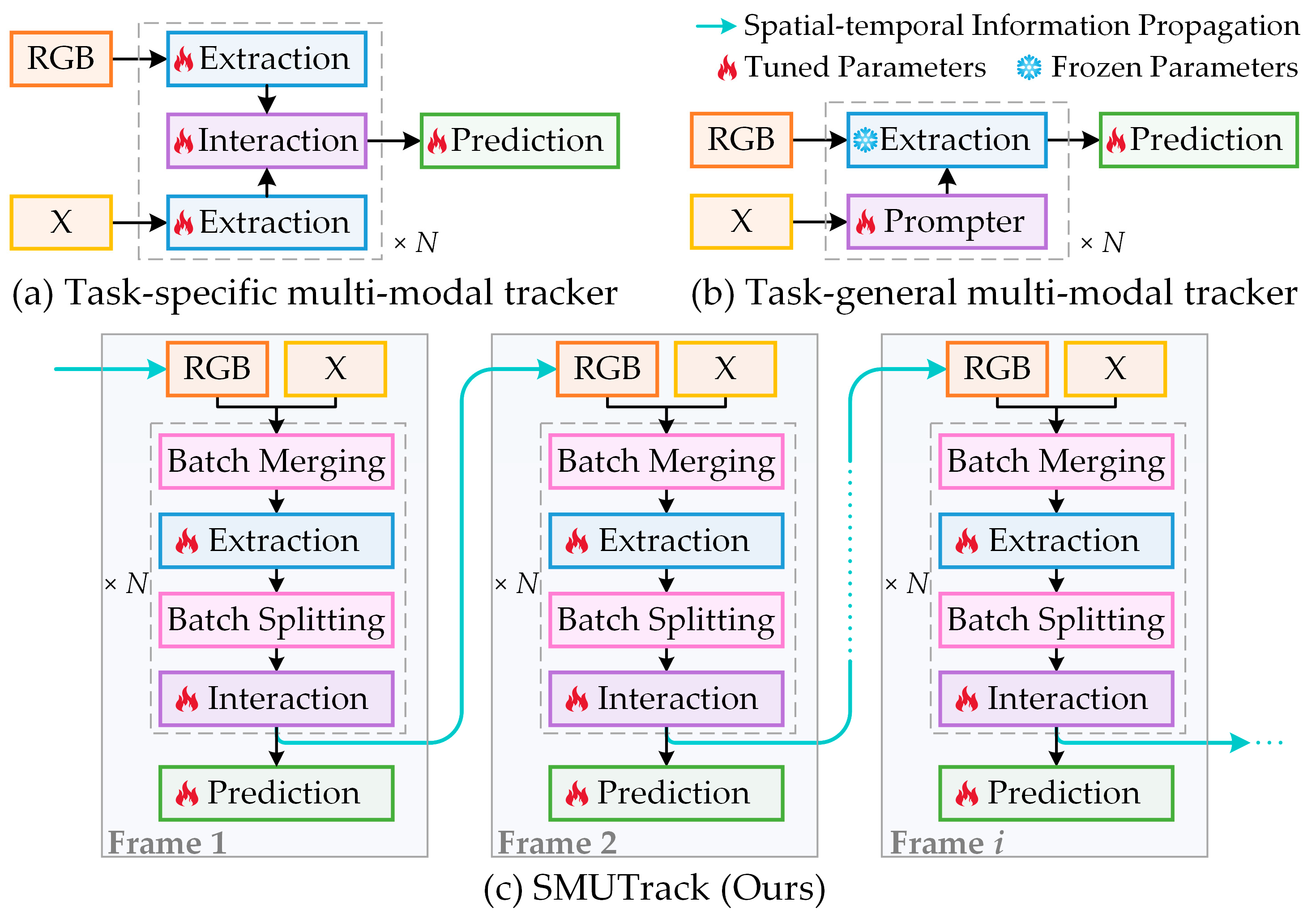 - Wu, Z.; Zheng, J.; Ren, X.; Vasluianu, F.-A.; Ma, C.; Paudel, D.P.; Van Gool, L.; Timofte, R. Single-model and any-modality for video object tracking. In Proceedings of the IEEE/CVF Conference on Computer Vision and Pattern Recognition, Seattle, WA, USA, 16–22 June 2024; pp. 19156–19166. [Google Scholar]