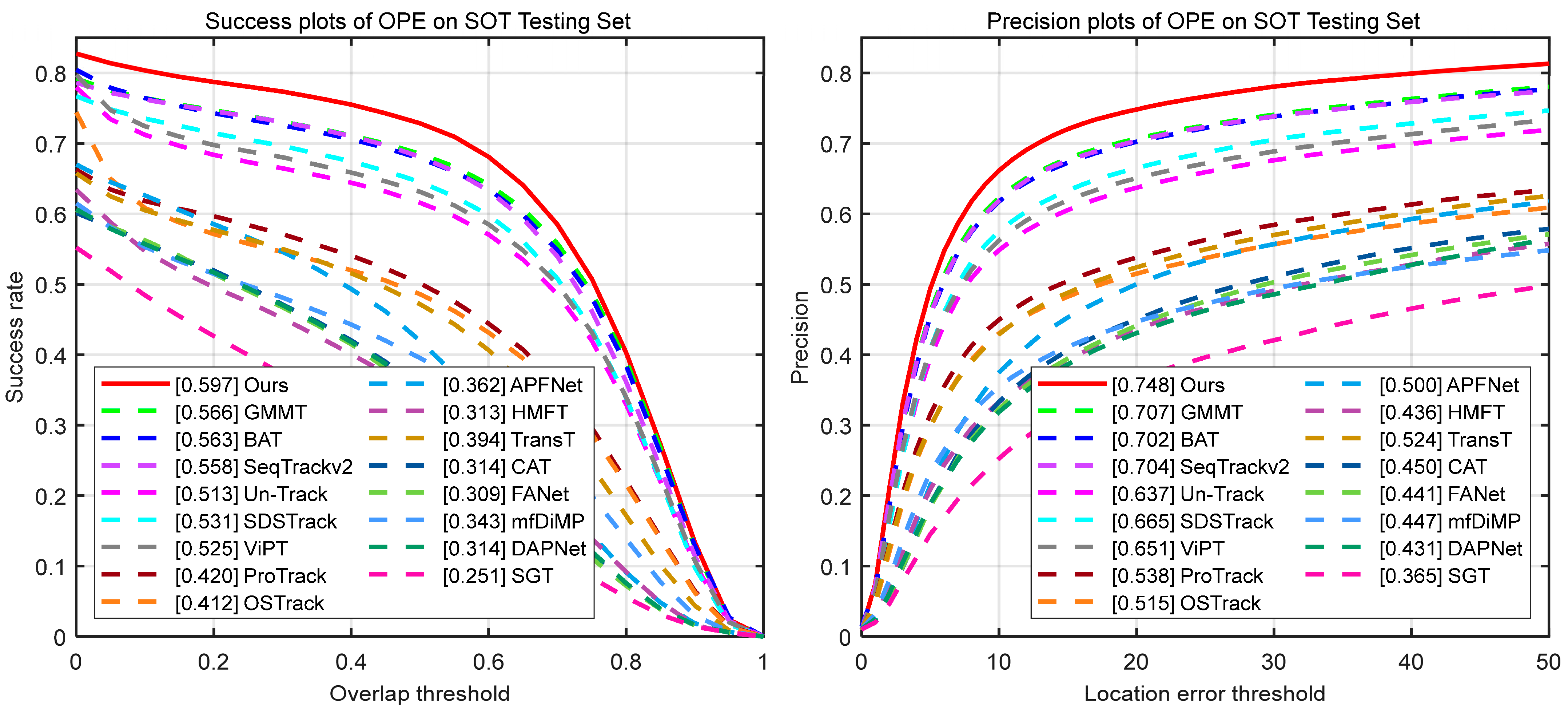 - Kristan, M.; Leonardis, A.; Matas, J.; Felsberg, M.; Pflugfelder, R.; Kämäräinen, J.-K.; Chang, H.J.; Danelljan, M.; Zajc, L.Č.; Lukežič, A. The tenth visual object tracking vot2022 challenge results. In Proceedings of the European Conference on Computer Vision, Tel Aviv, Israel, 23–27 October 2022; pp. 431–460. [Google Scholar]