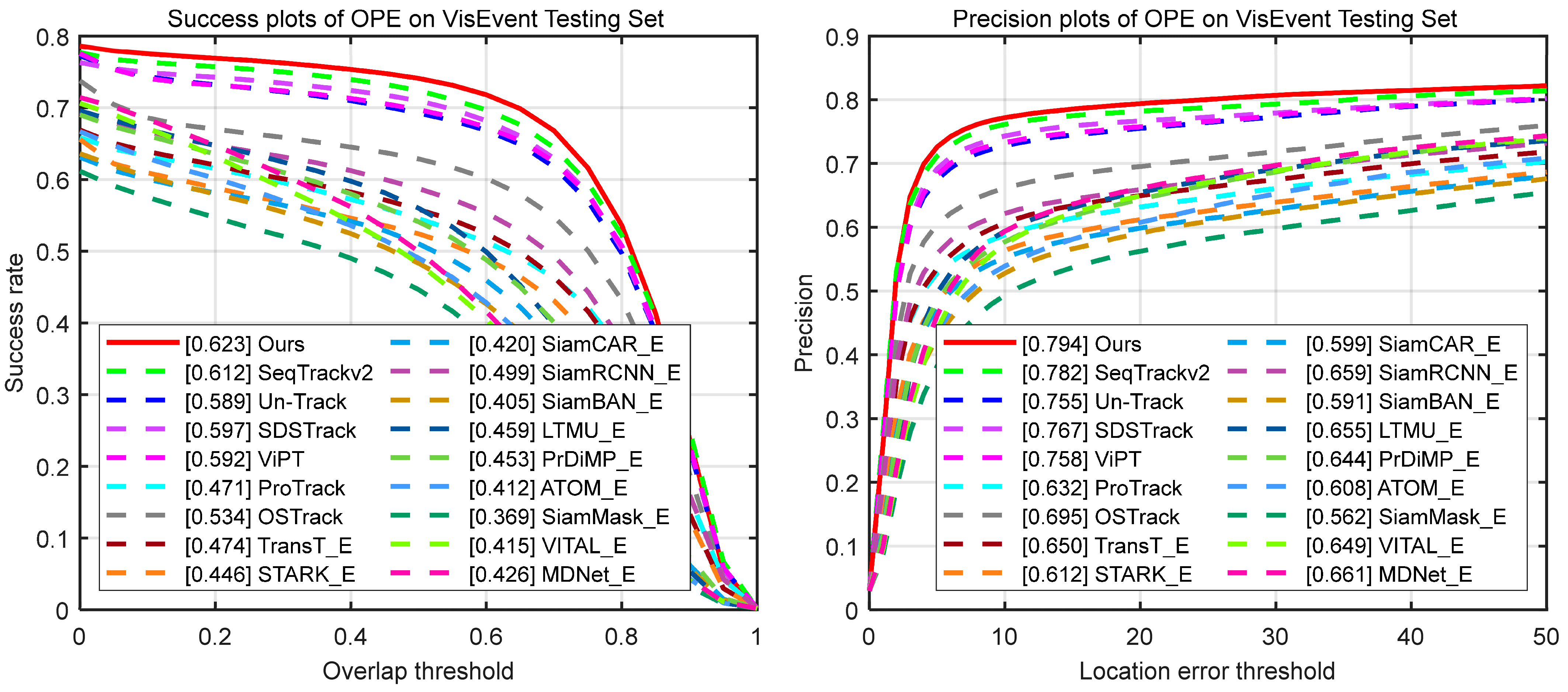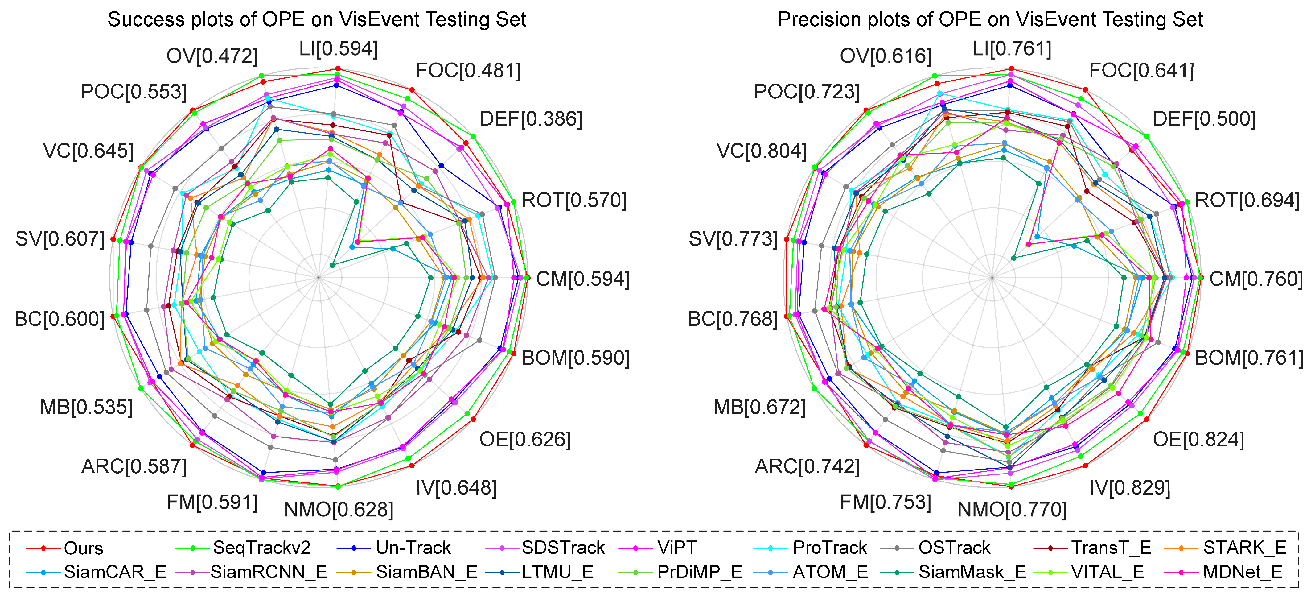 - Wang, X.; Li, J.; Zhu, L.; Zhang, Z.; Chen, Z.; Li, X.; Wang, Y.; Tian, Y.; Wu, F. Visevent: Reliable object tracking via collaboration of frame and event flows. IEEE Trans. Cybern. 2023, 54, 1997–2010. [Google Scholar] [CrossRef] [PubMed]