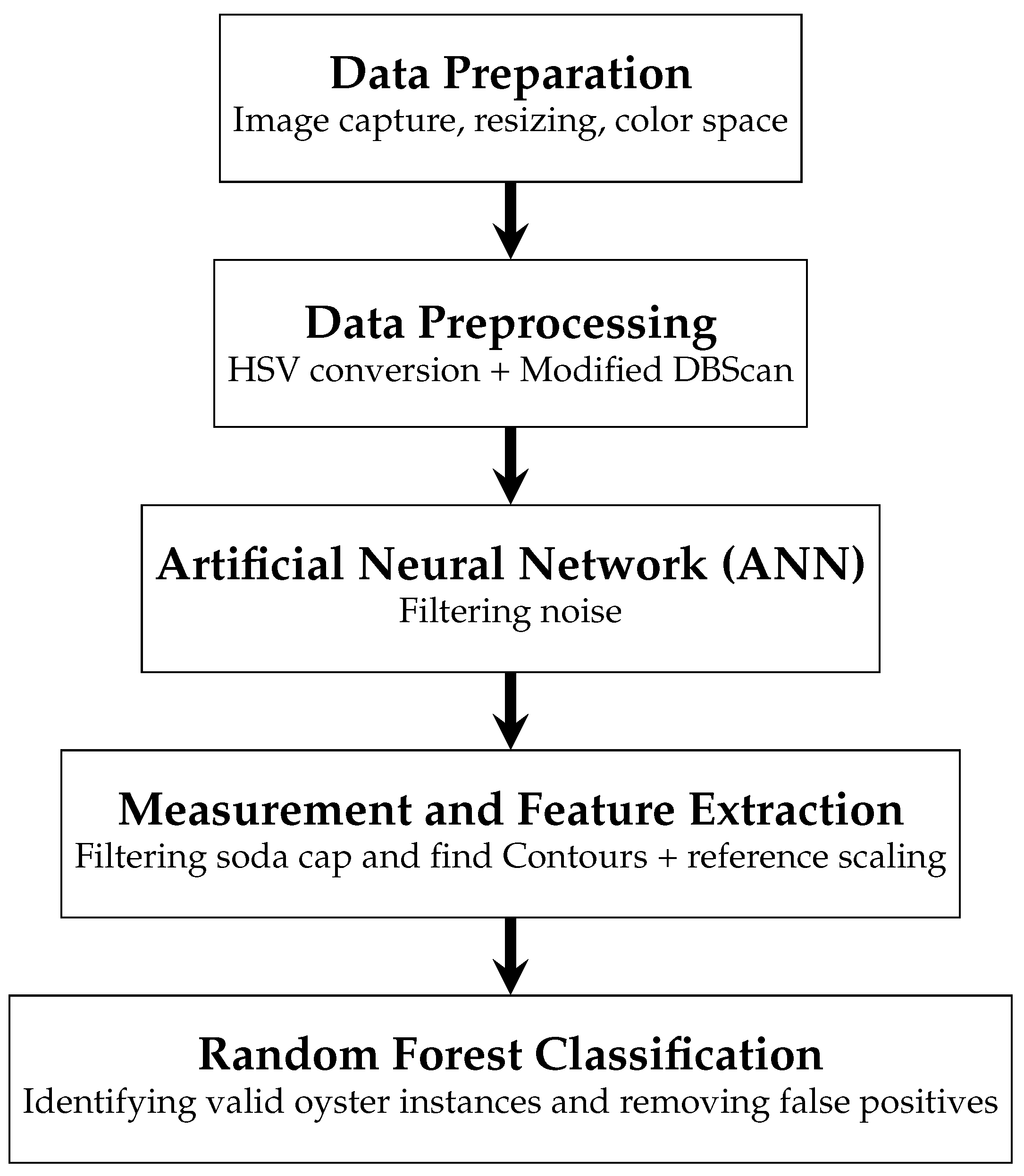The proposed method integrates artificial intelligence components, such as an artificial neural network (ANN) for filtering non-oyster elements and a Random Forest model for identifying valid oyster instances. These AI techniques significantly contribute to the robustness, scalability, and full automation of the measurement process.