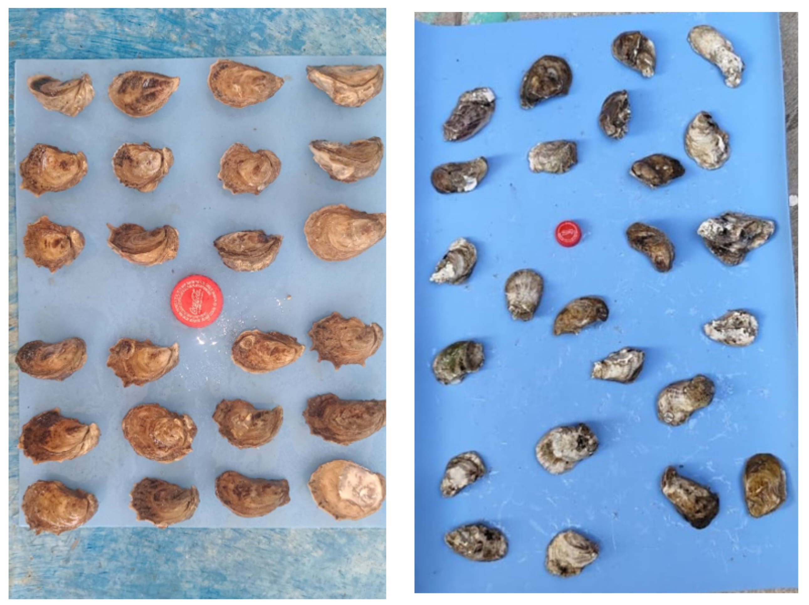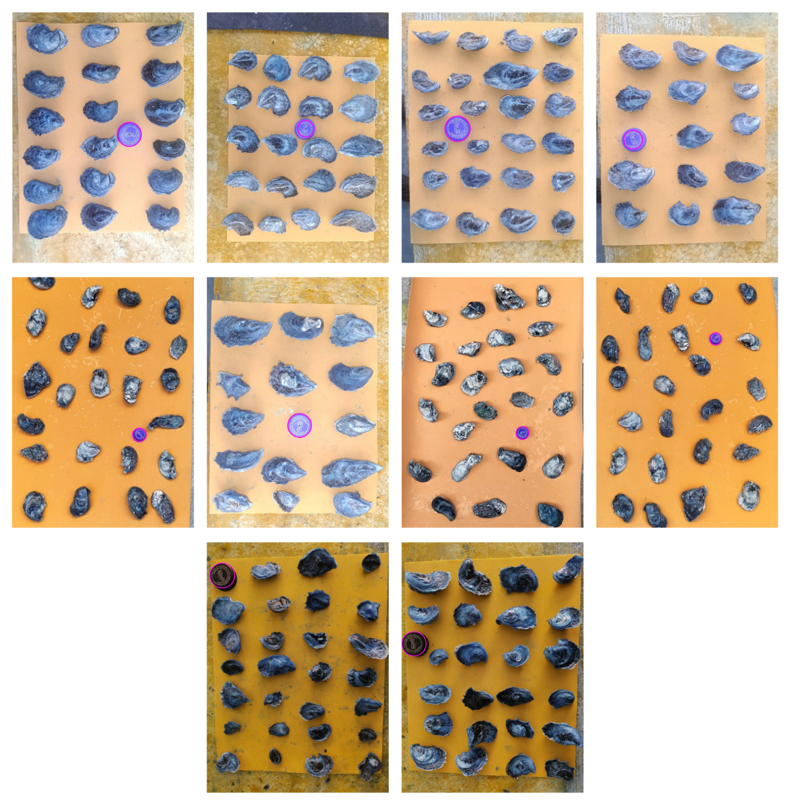 Figure 2, where oysters are evenly distributed on a blue background. We obtained the blue background by placing foam paper behind the oysters, which made the segmentation process more precise. The maximum dimension of the images is 1300 × 1300 pixels. We captured the images using a standard smartphone camera from the Redmi Note 13 Pro, which features a 200 MP-wide sensor with an aperture of f/1.7. All images were taken specifically during period of time between mid-morning and late afternoon (approximately 10:00 a.m. to 4:00 p.m.) to ensure consistent lighting conditions and avoid shadows caused by low sun angles. We did not use flash, and the smartphone was placed perpendicularly above the oyster sample, at a fixed height of approximately 40 cm. Each image contains a soda cap as a reference point, due to its widespread availability. These acquisition settings are recommended to ensure consistent segmentation quality and model performance under real field conditions. We have a limited number of images because there are few reliable, clean, and tested images of Crassostrea virginica oysters available.