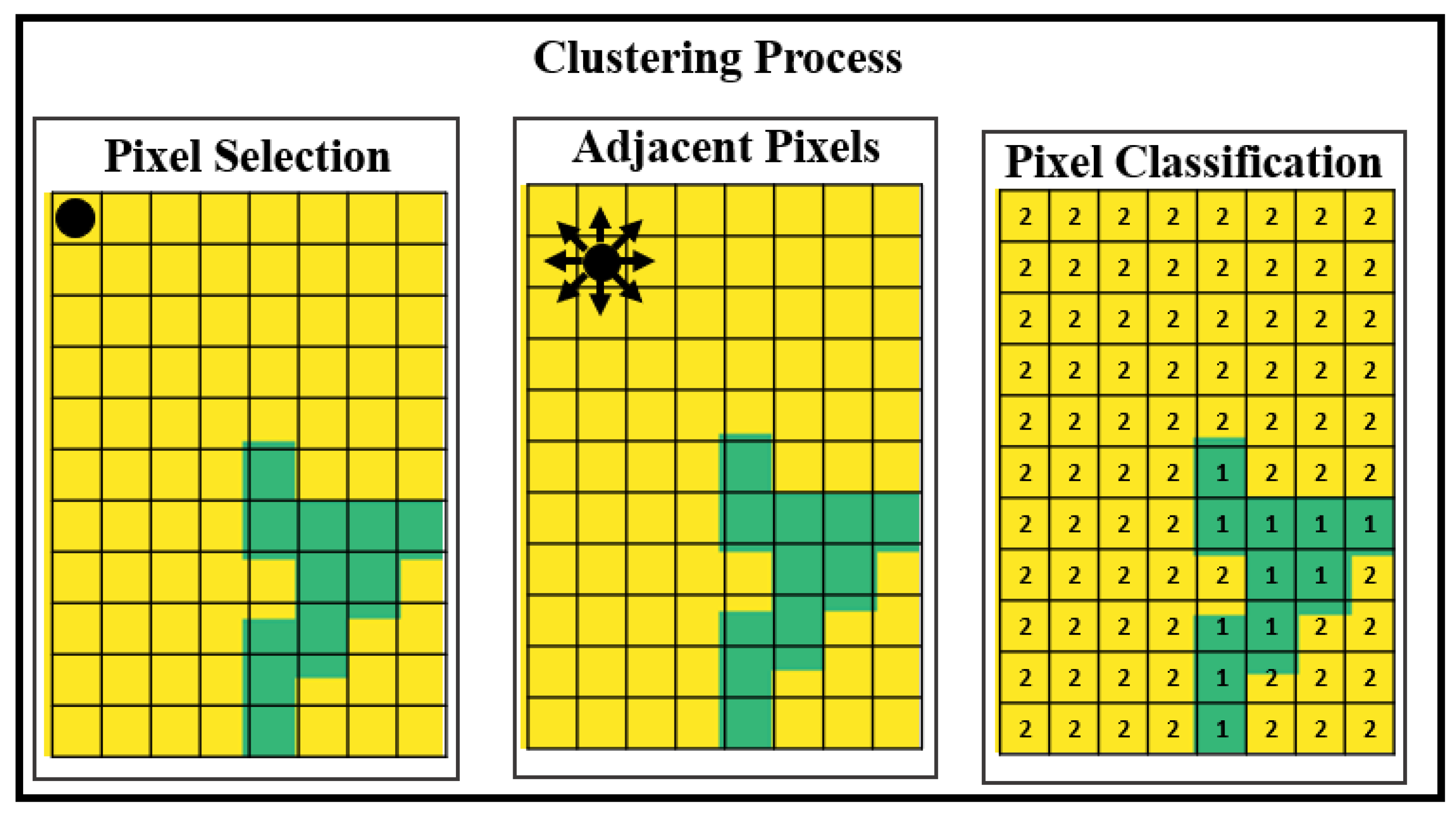 We classified each pixel of the image into one of three types: a value of −1 is assigned to pixels identified as outliers or as located on the edge of the image, 1 is assigned to pixels representing the boundary elements of detected groups, and 2 is assigned to pixels representing the centroids of detected groups within our modified DBScan algorithm.