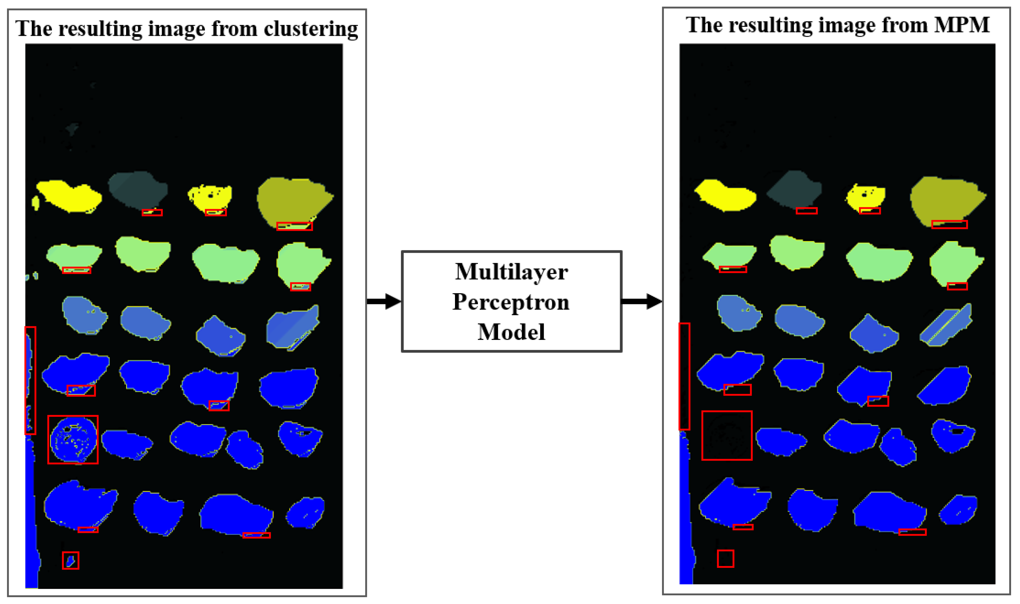 Figure 6, we can see that this cleaning process, performed by the ANN, significantly improves the overall quality of the segmentation in the same ten images used before. Based on experiments, an average of 7000 pixels in each image were modified or removed because they did not match the oysters.