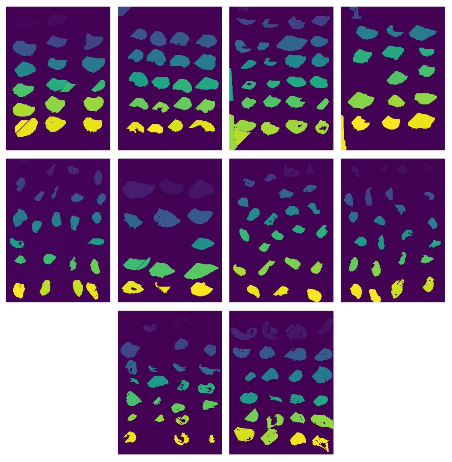 Figure 5 shows ten of the fifty resulting images after the segmentation process using the modified DBScan. We applied this segmentation to each of the ten images used to evaluate the methodology. We observe that in most cases, oysters are efficiently identified. However, the algorithm also identifies other groups corresponding to the background as individual groups, depending on the image quality or the presence of objects unrelated to oysters.