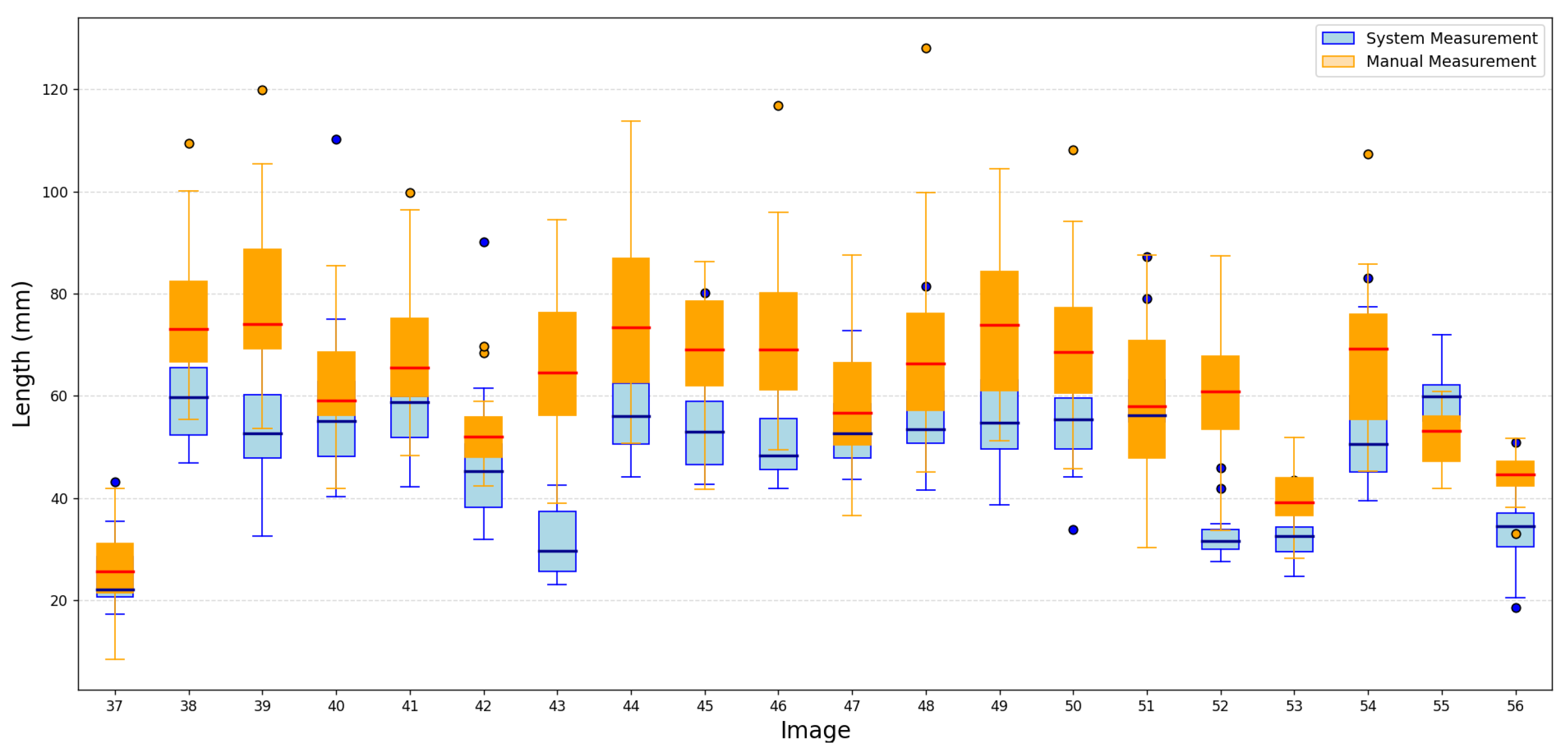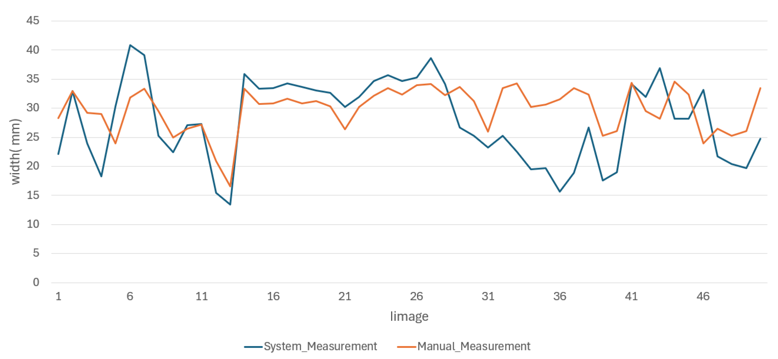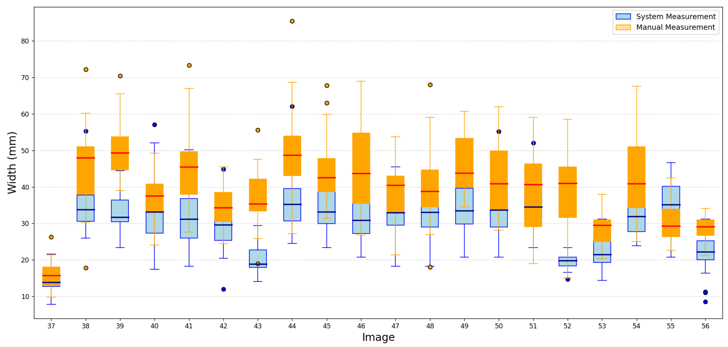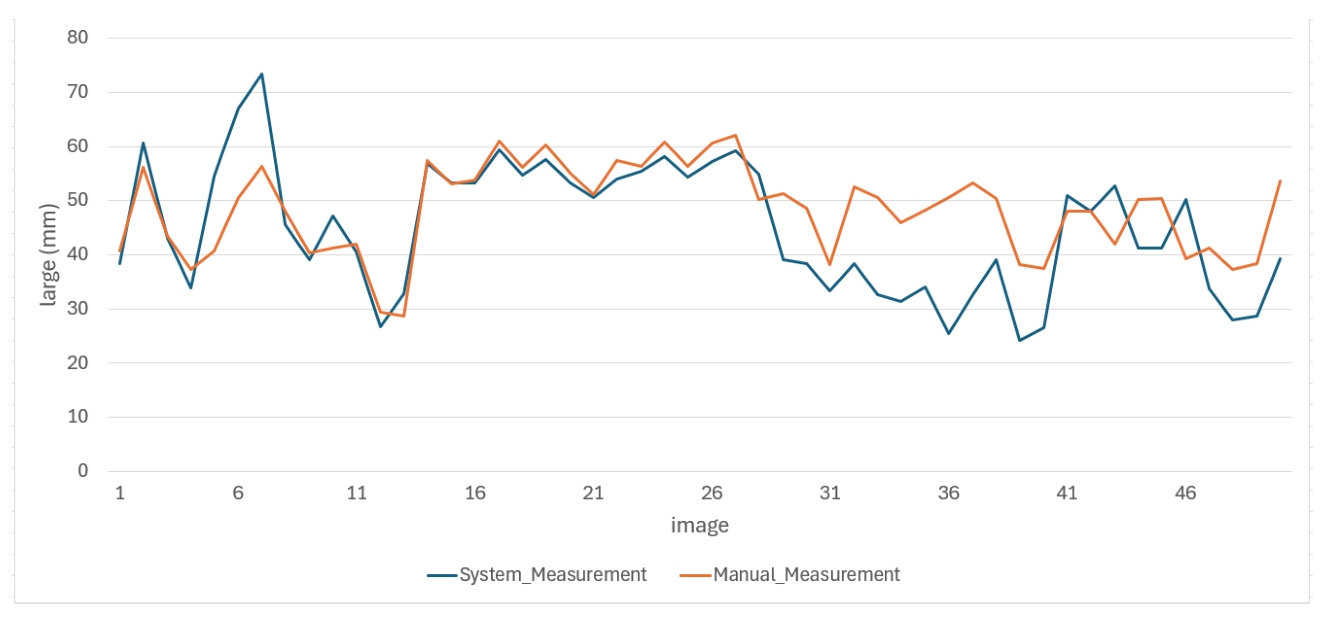 The proposed system provides a robust and efficient solution for image-based measurement tasks, offering both precision and significant time savings. To quantify its accuracy, we calculated the Mean Absolute Error (MAE) between the system measurements and the manual measurements for the 230 test images, considering both length and width. The MAE obtained was 12.2 mm for length and 7.8 mm for width. These results confirm that the proposed approach achieves a reasonable level of precision, even under constrained training conditions, and can be considered a robust solution for measurement tasks based on image analysis. Additionally, the average processing time per image using the system is approximately one minute, whereas manual measurement by a person takes around two minutes per image. This time represents a significant reduction in processing time, further supporting the practical applicability of the proposed system.