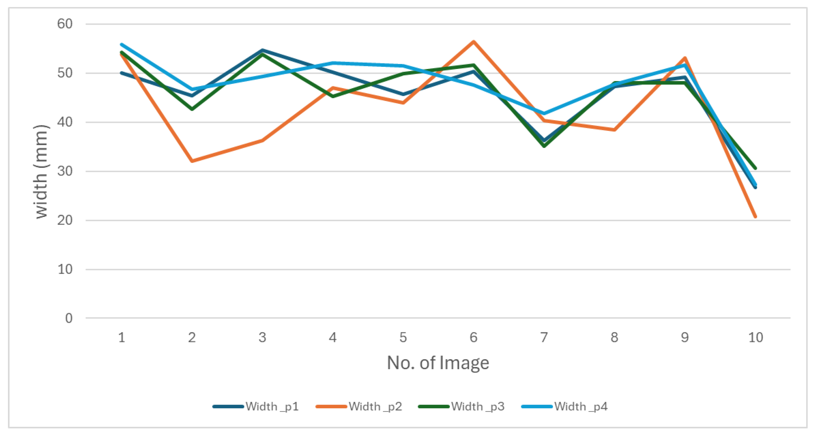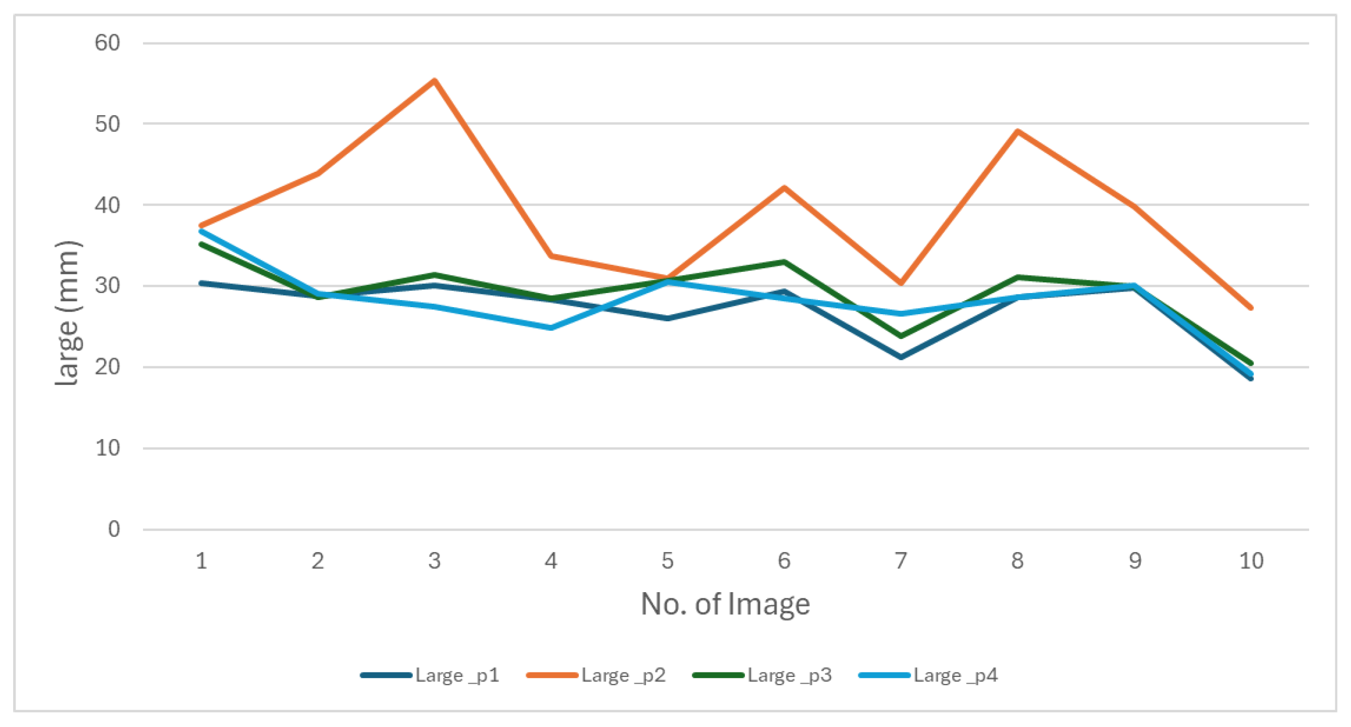 The figures show that the behavior of the measurements varies depending on the person performing them. These differences reflect the subjectivity inherent in manual measurements, as everyone applies different criteria to determine length and width. This variability makes it impossible to establish a single measurement as an absolute reference. These results highlight the need to develop a methodology that produces consistent data.