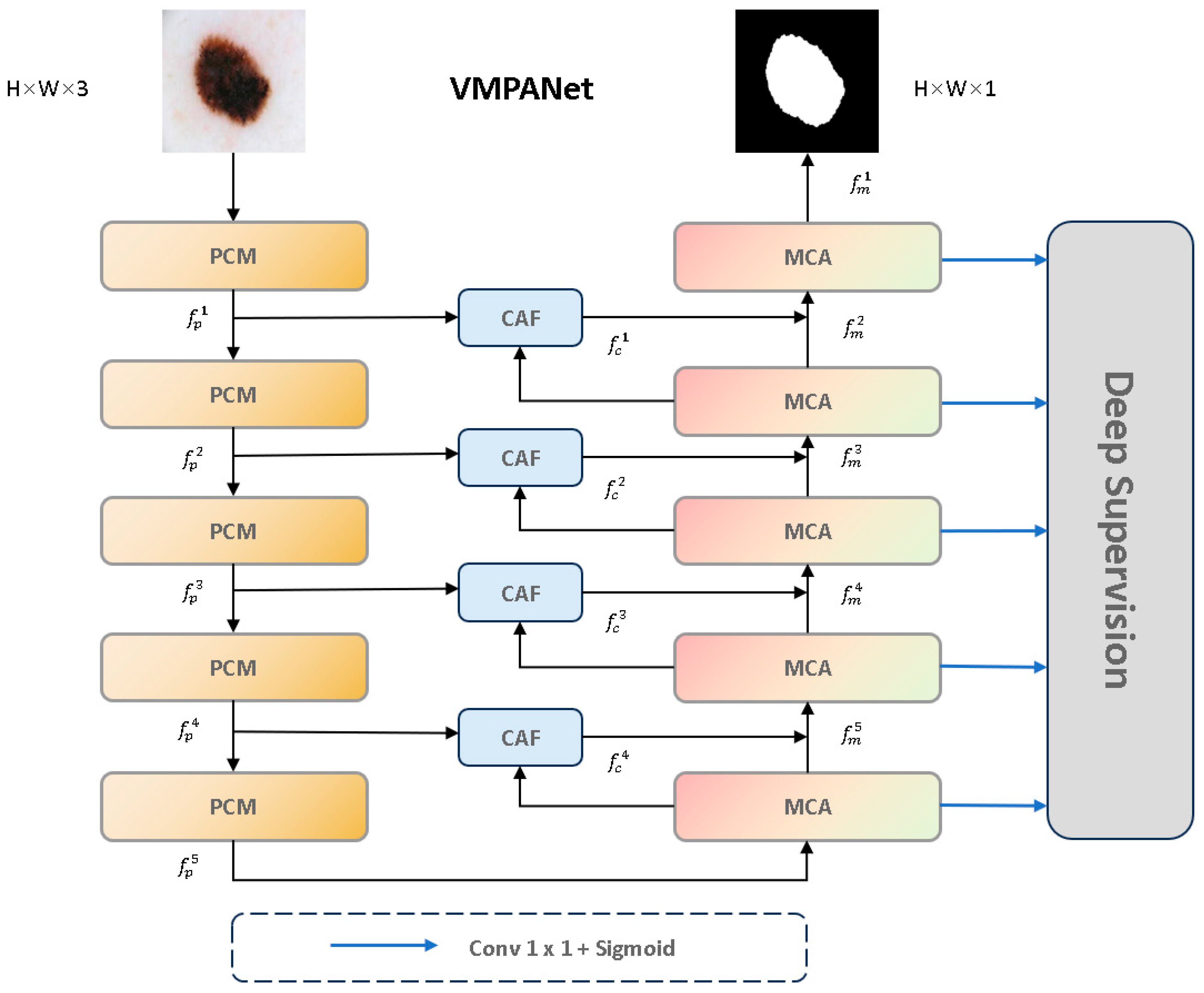 This section comprehensively describes the design of VMPANet, a lightweight network tailored for skin lesion image segmentation. We first introduce the overall architecture of the model, then detail the three core modules (PCM, MCA, CAF), respectively, including their structural designs, working mechanisms, and mathematical formulations. Finally, the loss function adopted in the training process is presented to address the specific challenges of skin lesion segmentation.