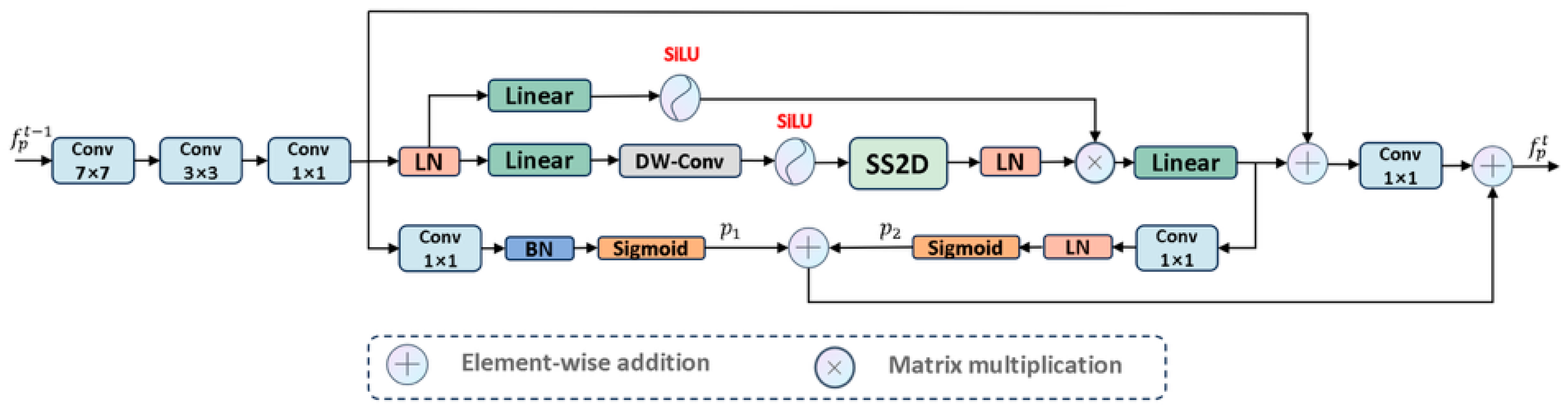 Figure 4, the PCM module adopts an inverted pyramid convolution approach to extract both global and local contextual information, effectively transitioning from a large receptive field to a small receptive field. Since the receptive field of convolutional layers is limited and can only handle intra-domain information, failing to capture extra-domain information effectively, we utilized visual Mamba to extract long-range dependencies. To propagate the features extracted by the PCM module effectively, we designed prompts based on previous studies [