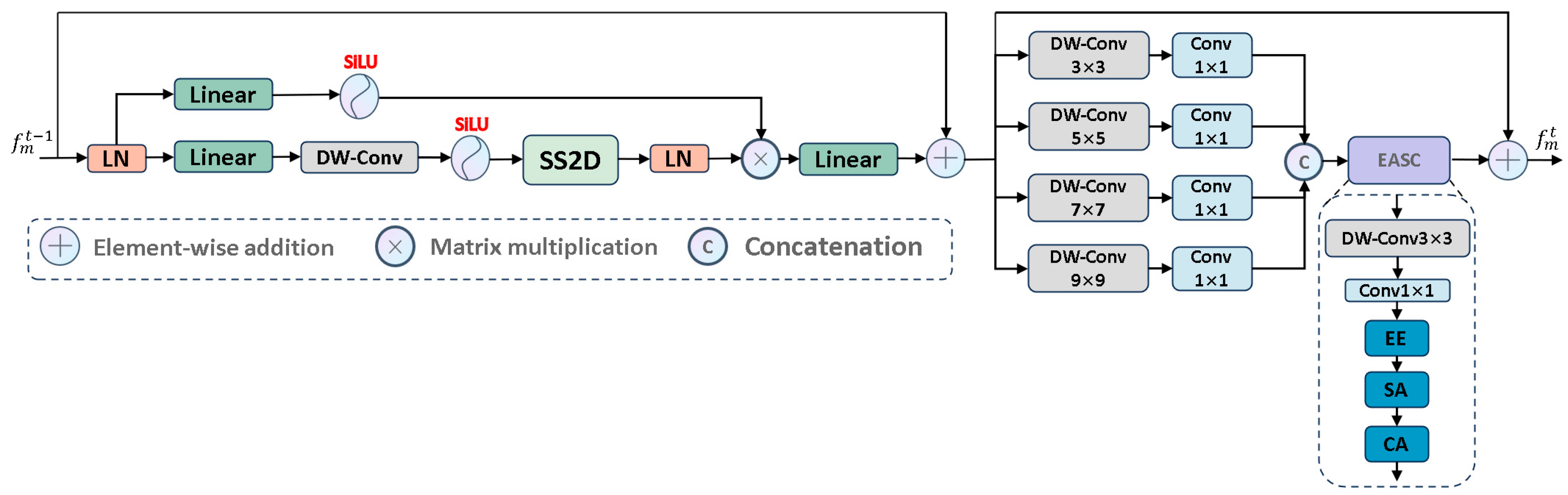 Figure 5. To effectively capture multi-scale feature representations, the MCA module first uses visual Mamba to establish long-term dependencies. The 2D Selective Scanning Block (SS2D Block) models long-term dependencies for each feature in four directions. To capture multi-scale detail information in hierarchical features and effectively address the direction sensitivity issue in 2D visual data, we used parallel depthwise separable convolutions to extract multi-scale features with different receptive fields and fine granularity, and aggregate information from the remaining four diagonal directions to enhance feature representation. Within each scale, it applies pointwise convolution to adaptively aggregate each feature map at that scale, achieving comprehensive feature representation. This approach aims to capture local texture details while better aggregating long-term dependencies. Next, we used the EASC module to adaptively extract important information from multi-scale features to enhance segmentation performance. Specifically, a combination of Edge Enhancement (EE), Spatial Attention (SA), and Channel Attention (CA) was used to improve the contrast between salient and non-salient regions from spatial and channel dimensions.