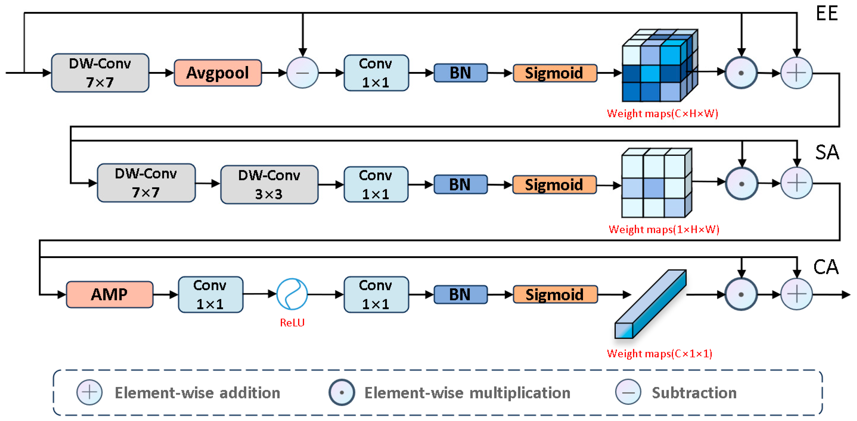 Figure 6. Specific steps include: first, we use large kernel depthwise separable convolutions to extract key global background information, thereby enhancing the model’s ability to accurately identify salient targets in complex environments. Next, we use small kernel convolutions to focus on local salient features. Finally, through the Sigmoid activation function, these features are converted into spatial saliency scores, assigning higher scores to salient regions and lower scores to background information. The specific process is as follows: