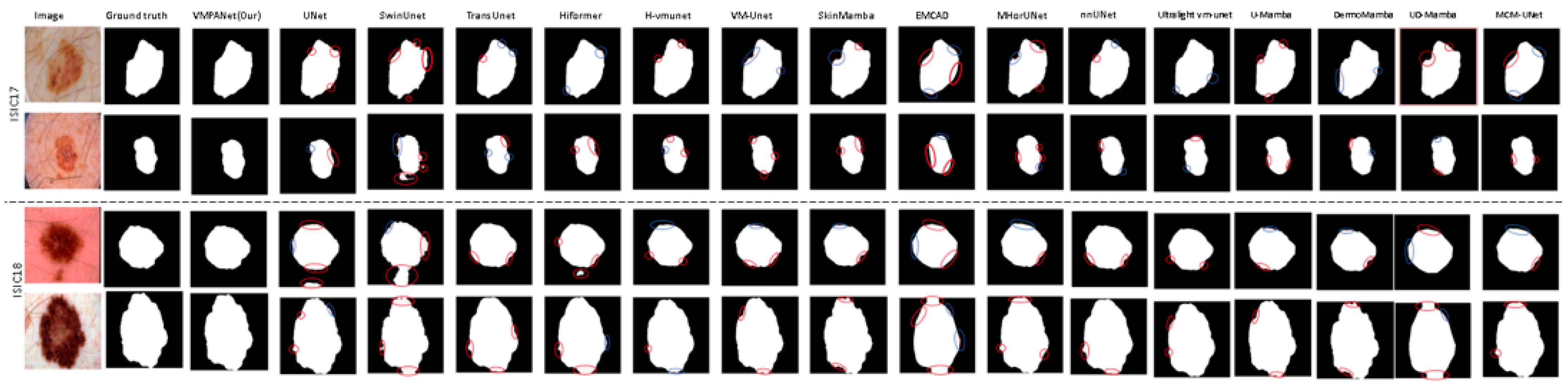 Figure 8. Most methods struggle with segmenting the complex edge structures of lesions, whereas VMPANet demonstrates superior robustness in handling these complexities. Many methods face challenges with low contrast and background interference, but VMPANet effectively addresses these issues, producing smoother and more accurate contours and boundaries. Overall, our method emphasizes both global and local information, as well as multi-scale information at different granularities, to capture significant targets in medical images. While edge enhancement can learn the differences between edge and non-edge regions to complement target contour details, it introduces errors, making it difficult for models to capture fine details in low-contrast and complex edge scenarios. Our spatial and channel attention mechanisms enable the model to adaptively focus on important targets, enhancing robustness against interference. Furthermore, we incorporate a self-attention mechanism to facilitate the complementarity between deep semantic information and shallow detail information, thereby thoroughly identifying significant targets in complex tissues.