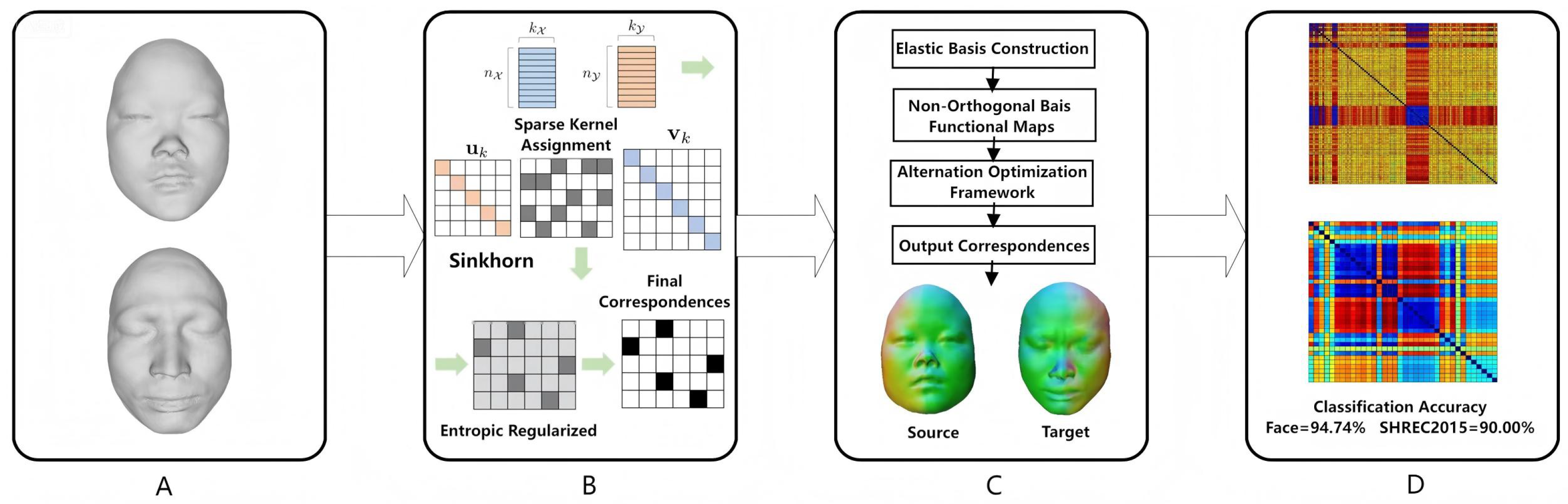 Figure 1 illustrates the framework of the non-isometric 3D shape matching algorithm based on elastic functional maps. The specific procedural steps are as follows: (A). Input 3D Models: The input 3D models undergo non-isometric transformations, where their geometries are deformed in a manner that does not preserve the original distance and angle relationships. This deformation causes stretching, compression, bending, or twisting in specific regions, thereby altering local or global geometric properties. (B). Initial Map Calculation: Sparse kernel allocation is performed on the input models. An entropy-regularized transport plan is generated through Sinkhorn iterations, from which the final correspondence is extracted to complete the initial map computation. (C). Elastic Basis Calculation: The SRE-FMaps framework is constructed to generate a non-orthogonal basis functional map. An alternating optimization framework is employed to refine the mapping, ultimately outputting the correspondence between the two models. (D). Distance Calculation and Classification: Based on the established correspondence, the distance between models is computed, followed by classification to evaluate and output the classification accuracy.