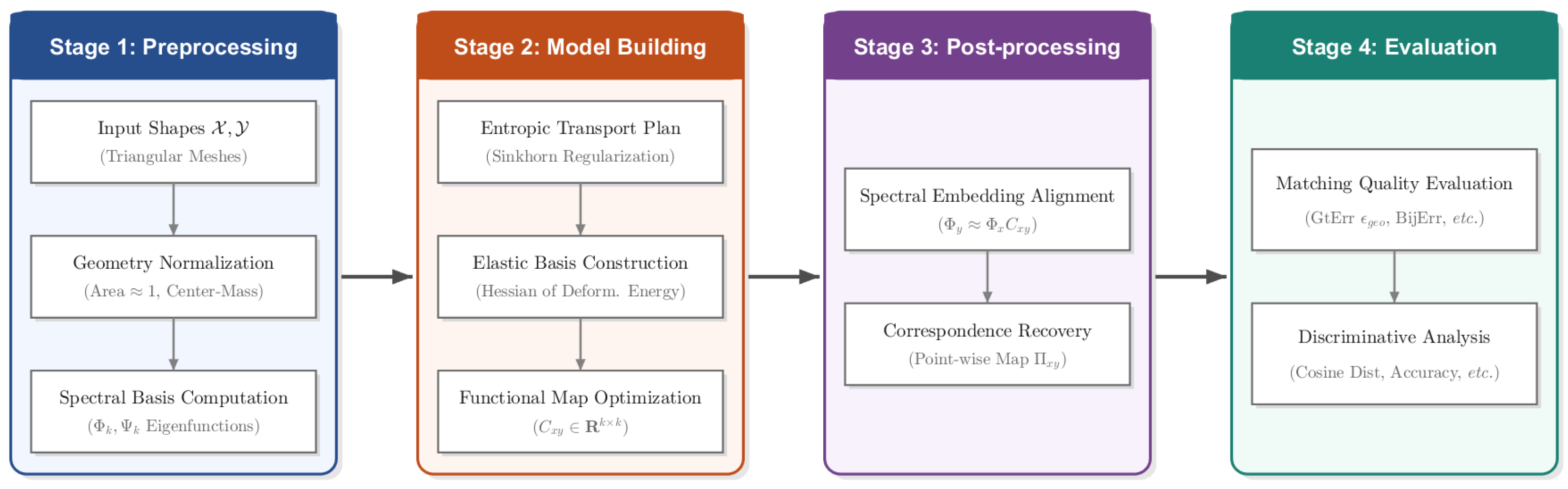 To strictly evaluate the proposed method within a comprehensive experimental context, we adopt a systematic methodological pipeline, as illustrated in Figure 2. This pipeline encompasses four sequential stages: Stage 1 (Pre-processing) performs data standardization and spectral basis construction to establish the geometric representation space; Stage 2 (Model Building) implements the core SRE-FMaps algorithm, integrating Sinkhorn initialization and elastic functional map optimization; Stage 3 (Post-processing) converts the computed functional maps into point-to-point correspondences; and Stage 4 (Evaluation) quantifies performance using matching metrics (e.g., geodesic error, bijectivity error, etc.) and classification metrics (e.g., cosine distance [27], etc.).