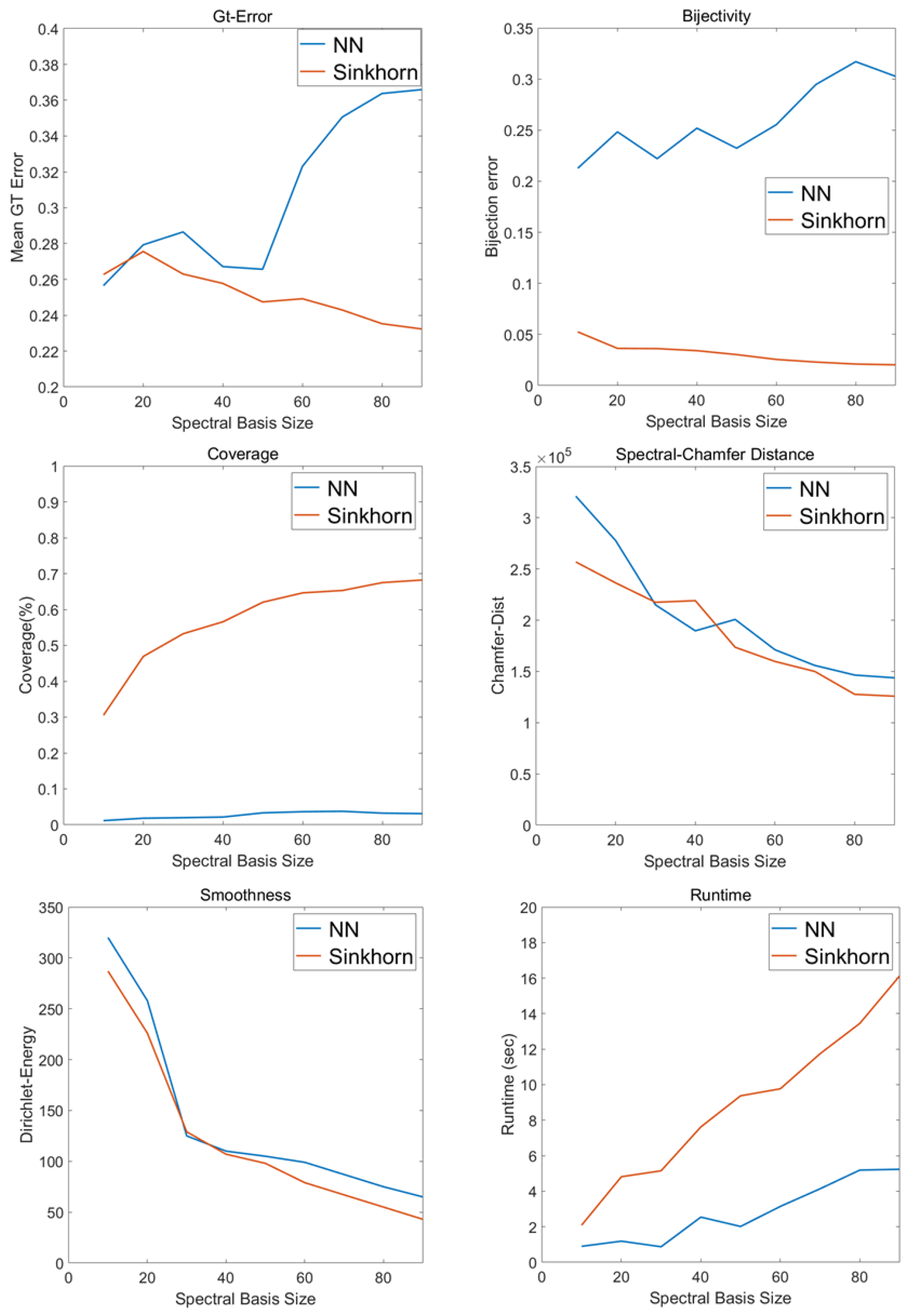 Parameter evaluation was conducted on the McGill dataset. We selected a representative pair of non-isometrically deformed human shapes and performed an ablation study to validate the effectiveness of the core components within our framework. Specifically, we compared multiple initialization strategies (nearest neighbor [NN] vs. Sinkhorn) and spectral bases (Laplace–Beltrami [LB] vs. elastic basis [EB]) by varying the number of basis functions. Performance was assessed in terms of both accuracy and efficiency using six widely adopted metrics: average geodesic error, bijectivity error, coverage, Chamfer distance, smoothness, and runtime.