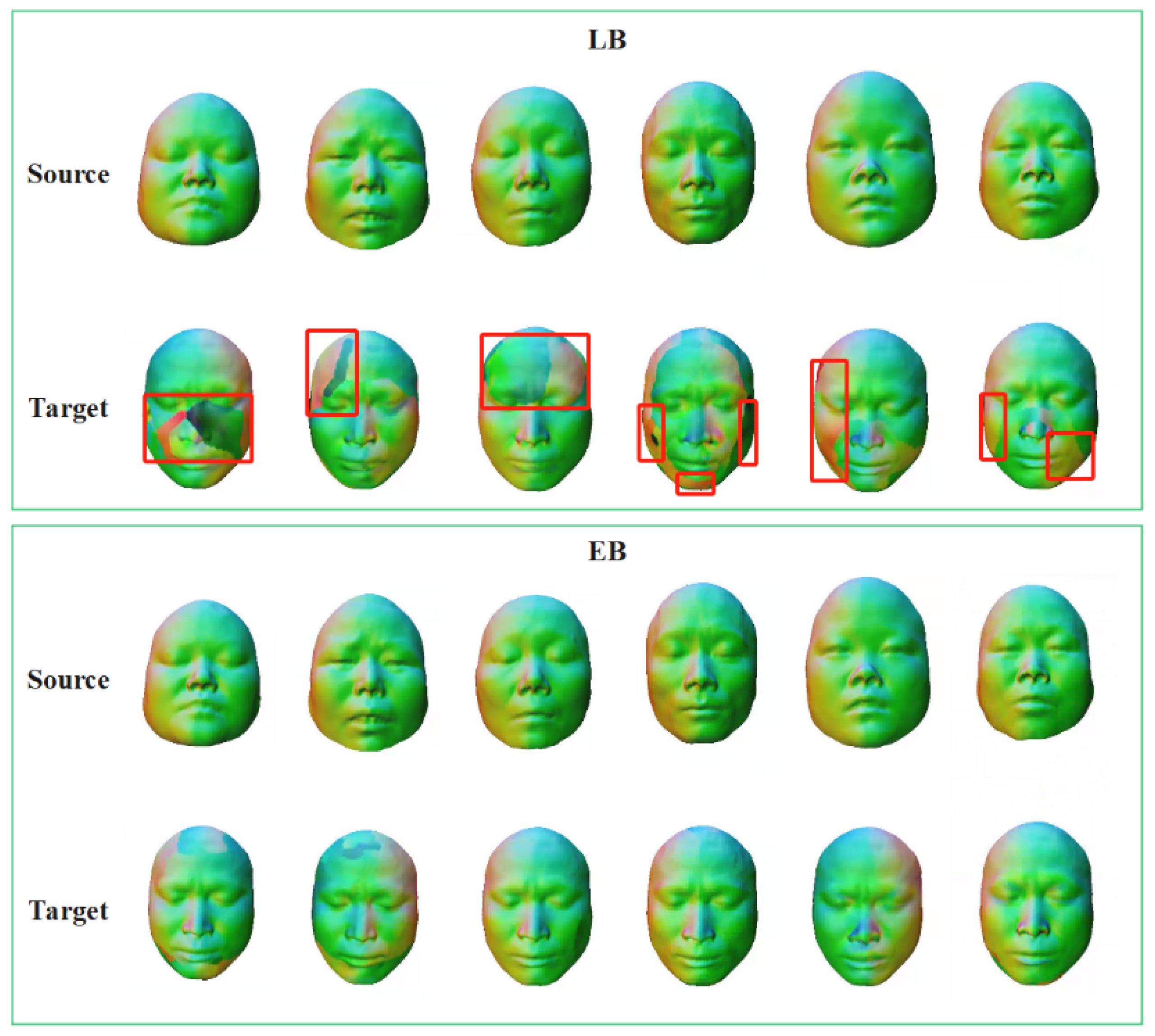 Figure 5. Visual correspondence comparison between the Laplace–Beltrami (LB) operator and the elastic basis (EB) on the Face dataset.