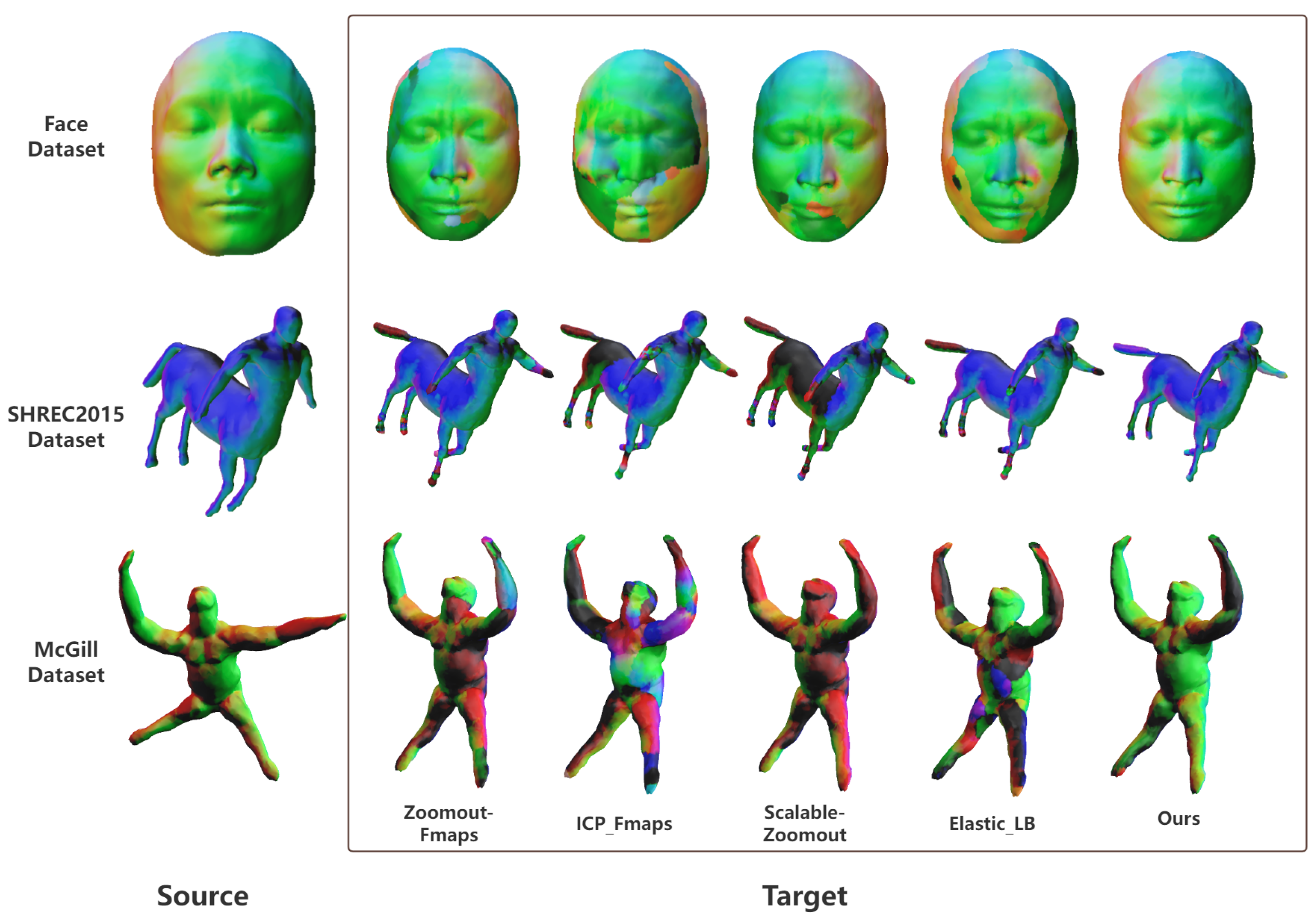 Three-dimensional shape matching is a core problem in computer vision and geometric processing, whose essence is to establish point-wise correspondences between models while preserving geometric or semantic consistency. This task plays a pivotal role across multiple critical application scenarios. In medical imaging, 3D organ modeling enables precise anatomical simulation, supporting drug response assessment and disease mechanism analysis [1]; in face modeling, non-rigid 3D correspondence is fundamental for handling expression variations, directly influencing face recognition robustness [2]; and in industrial inspection, deformation-aware surface recovery ensures accurate structural defect detection in mechanical components, thus safeguarding product reliability [3]. Across these scenarios, non-isometric deformation—characterized by local nonlinear geometric variations such as bending, twisting, and stretching—poses a major challenge, making robust non-isometric matching a prerequisite for real-world deployment.