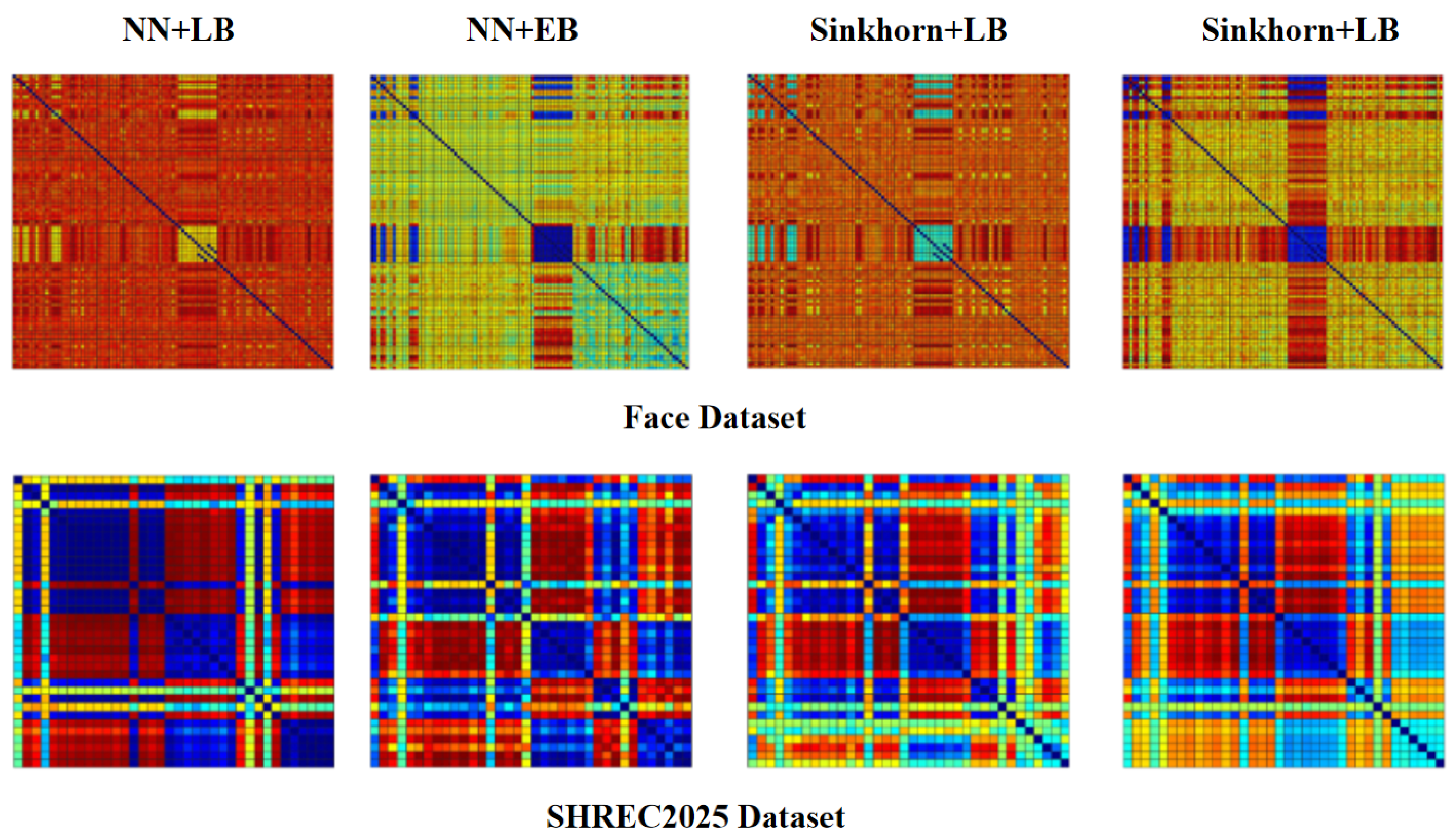 Figure 7. Cosine distance heatmaps generated by different correspondence strategies. In the heatmaps, warmer colors (e.g., red, yellow) represent smaller cosine distances (higher similarity), while cooler colors (e.g., blue, cyan) represent larger cosine distances (lower similarity). Sinkhorn + EB exhibits clear block-diagonal structures with high intra-class compactness and inter-class separability on both Face and SHREC2015 datasets.