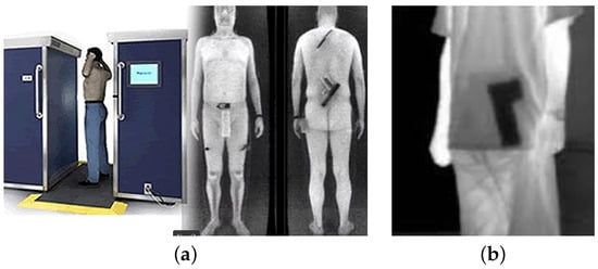 (a) Example of an X-ray scanner used to detect concealed objects on a person [2]. (b) Example of an infrared camera used to detect concealed objects on a person [3].