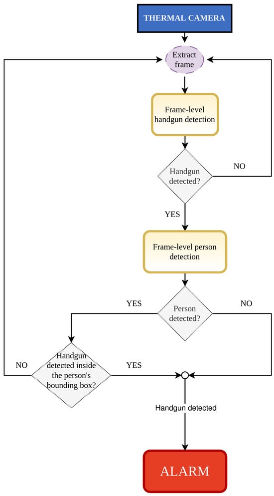 This combination represents a cutting-edge approach to concealed weapon detection that holds the potential to revolutionize security measures across a variety of sectors, including airports, public transportation hubs, government buildings, and other high-security areas. Our method is based on two detection stages: frame-level handgun detection and frame-level person detection. First, the handgun detector decides whether there is a gun in the processed frame or not, discarding it if nothing is detected. Nevertheless, if a gun is detected, then a person detector is applied and it is checked if the previously detected gun is contained in the person’s area. If no person is detected, an alarm is triggered either way, just in case; if a person is detected and the gun is contained in that area, an alarm is triggered; if a person is detected and the gun is not contained in that area, the alarm is not triggered, as the gun detection is not considered to be legit.
