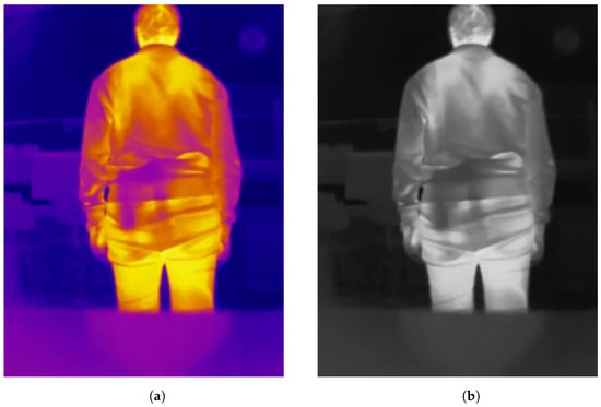- Preprocessing. To initiate the process, a frame from the thermal camera feed is first extracted. We tested our method in two configurations: one using the described datasets and another by integrating it into an Android app. For the datasets, images were converted to grayscale. Aside from this conversion, no additional preprocessing, such as contrast adjustment, was applied. For the Android app implementation, the camera outputs grayscale images directly, making further preprocessing unnecessary. Taking heed of the conversion of the images of the datasets to grayscale (the only preprocessing operation carried out), this was only needed in the case of the “UCLM Thermal Imaging Dataset”, as the “Concealed Pistol Detection Dataset” images were already in grayscale. The conversion was performed in Python in its 3.10 version [20] with the OpenCV library [21]. After loading the original images, which had a hot colormap applied [22] to them, we used the cv2.COLOR_BGR2GRAY option to convert them into grayscale. COLOR_BGR2GRAY color mode applies the Equation (1) to convert from any three-channel image to a one-channel image. See Figure 5 as an example of the conversion operation of a frame from the “UCLM Thermal Imaging Dataset”.