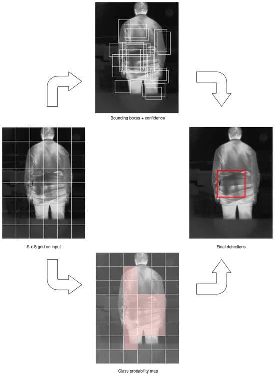 We chose to use a YOLO mainly because of its ability to make predictions about object locations and classes quickly in a single pass over the image, unlike other object detection methods that require multiple stages or “passes” of the image. YOLO divides the input image into a grid of S × S cells. Each cell is responsible for predicting whether an object exists in that region of the image or not. As newer versions were developed, mechanisms were improved to detect multiple objects per cell and better handle small objects. Each cell in the grid generates several bounding boxes, which are rectangles that could potentially contain an object. Each bounding box includes the coordinates for the center of the object; the width and height of the box; a “confidence score”, which represents the probability that there is actually an object in that box. For each bounding box, YOLO also predicts a set of classes (e.g., “person”, “dog”, “car”) with associated probabilities. Finally, YOLO uses a method called Non-Maximum Suppression (NMS) [26] to reduce redundant predictions. The general process followed by a YOLO model is shown in Figure 8.