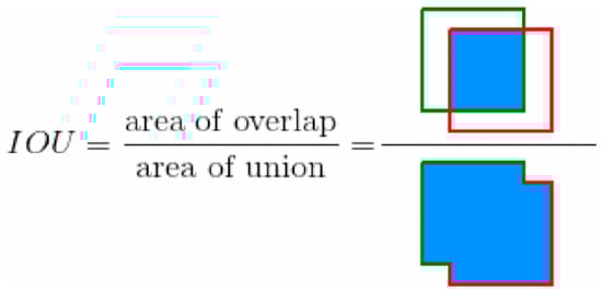 - True Positive (TP). A detection is considered a true positive when the predicted bounding box correctly identifies an object and sufficiently overlaps with the ground truth bounding box. Before explaining the next concepts, it is key to understand what “overlapping” means in this context, and that is the Intersection over Union (IoU). In the object detection scope, the IoU measures the overlapping area between the predicted bounding box B_p and the ground truth bounding box B_gt divided by the area of union between them (see Equation (2)). By comparing the IoU with a given threshold t, we can classify a detection as being correct or incorrect. If then the detection is considered as correct. If the detection is considered as incorrect. For a better understanding, the IoU concept is graphically described in Figure 9.