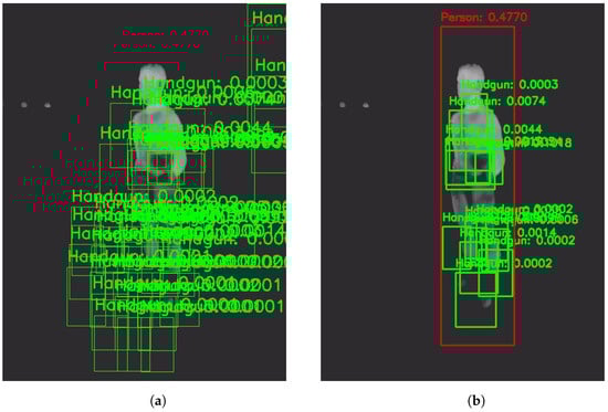 (a) Result with the method proposed in [10]. (b) Same image, result with the proposed method. “Concealed Pistol Detection Dataset”. All detections considered. Models’ min confidence value: 0.0001.