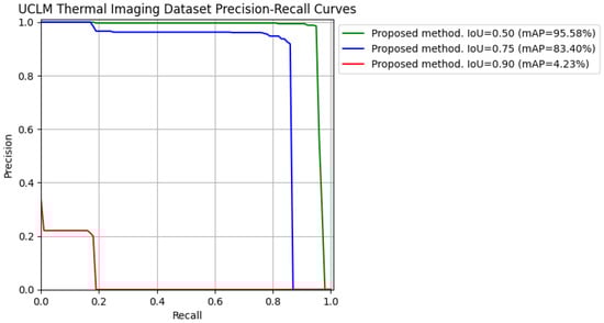 Precision–recall curves for IoU = [0.50, 0.75, 0.90] obtained from testing the proposed method on the “UCLM Thermal Imaging Dataset”.