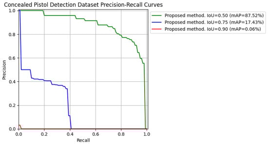 Precision–recall curves for IoU = [0.50, 0.75, 0.90] obtained from testing the proposed method on the “Concealed Pistol Detection Dataset”.