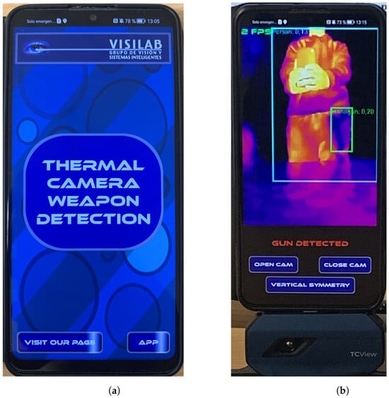 The code implements the proposed method considering only the case where the detection with the highest score for each class is selected. The app consists of two main screens (see Figure 13): a menu, where the user can click on a button that redirects him/her to our website (https://visilab.etsii.uclm.es/?page_id=1029, accessed on 5 October 2024), or a button to click to access the detector. This detector constitutes the second main screen of the app. It starts as a black screen with three buttons on it. One button is to open the thermal camera once it is attached via Universal Serial Bus (USB) to the smartphone; another one is to close the camera; the third one is to reflect the image over the vertical axis (depending on where the thermal camera is facing). Now, the thermal camera needs to be connected and, by clicking on the “open cam” button, permissions are requested, and, if conceded, the camera opens and the detector starts working.