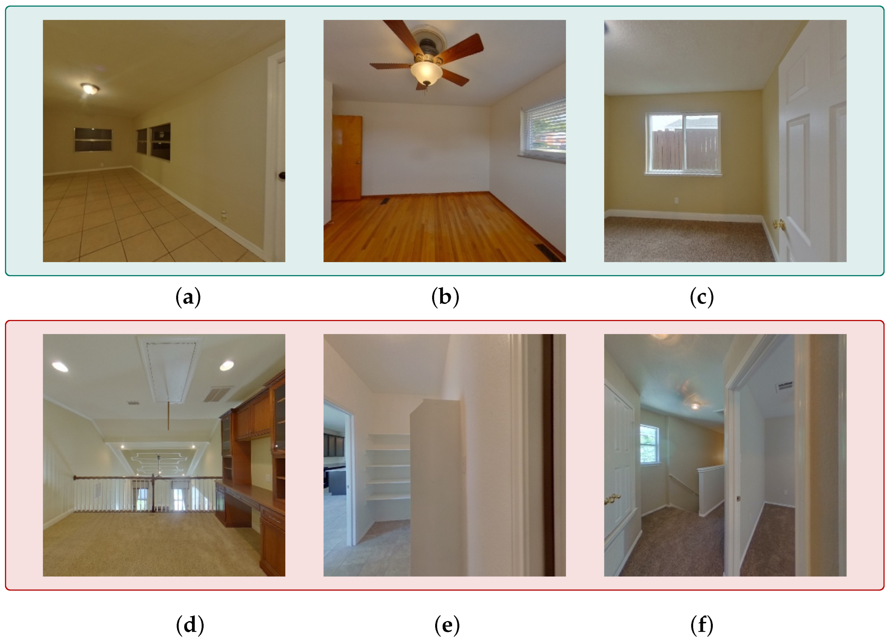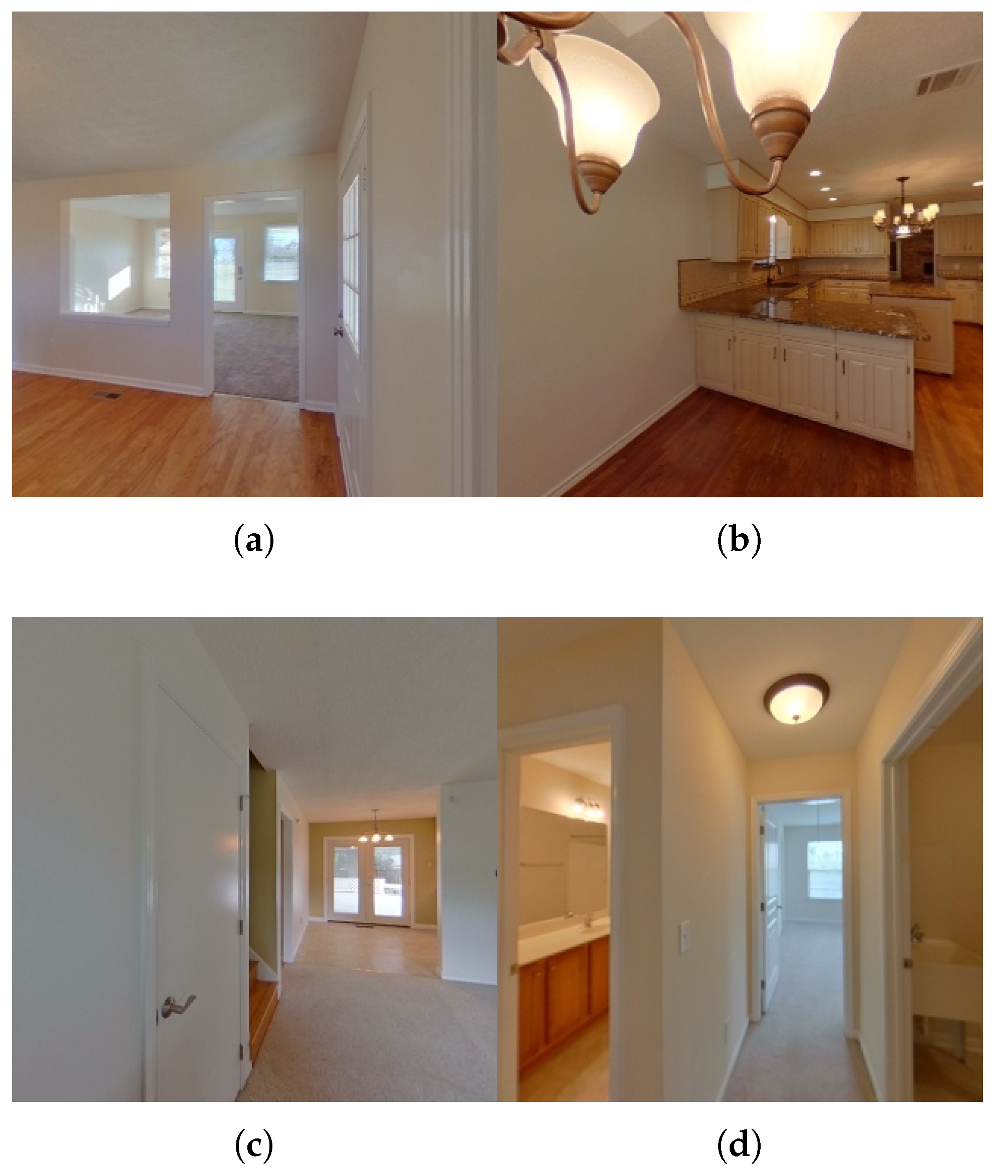 - Cruz, S.; Hutchcroft, W.; Li, Y.; Khosravan, N.; Boyadzhiev, I.; Kang, S.B. Zillow Indoor Dataset: Annotated Floor Plans With 360º Panoramas and 3D Room Layouts. In Proceedings of the IEEE/CVF Conference on Computer Vision and Pattern Recognition (CVPR), Virtual, 20–25 June 2021; pp. 2133–2143. [Google Scholar]