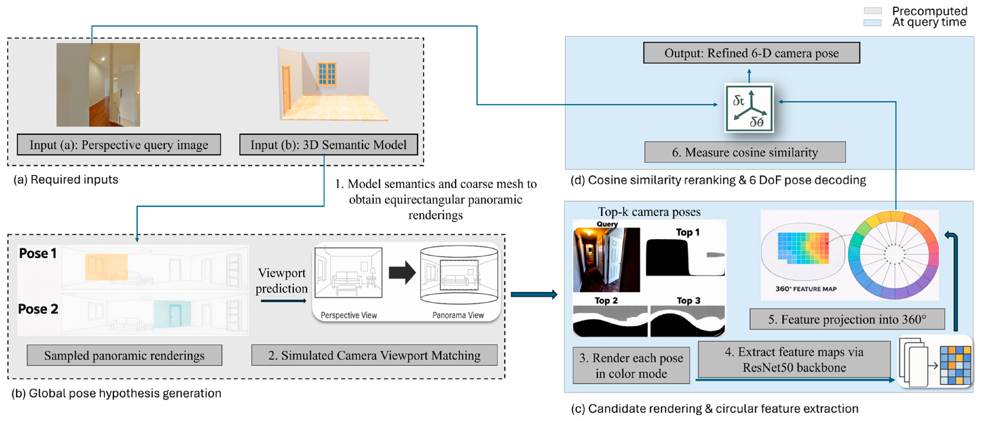 - Stage 1: InitializationAt query time, we begin by semantically segmenting the 3D room mesh and then render a set of panoramic viewports on a uniform 1.2 m × 1.2 m grid, requiring far fewer samples than LaLaLoc’s [23] layout based approach. Inspired by the basal pipeline in [9], each rendered panorama and the input perspective image are passed through pretrained backbones: EfficientNet-S [40] for the query images and DenseNet [41] for the panoramas, to produce dense feature maps.