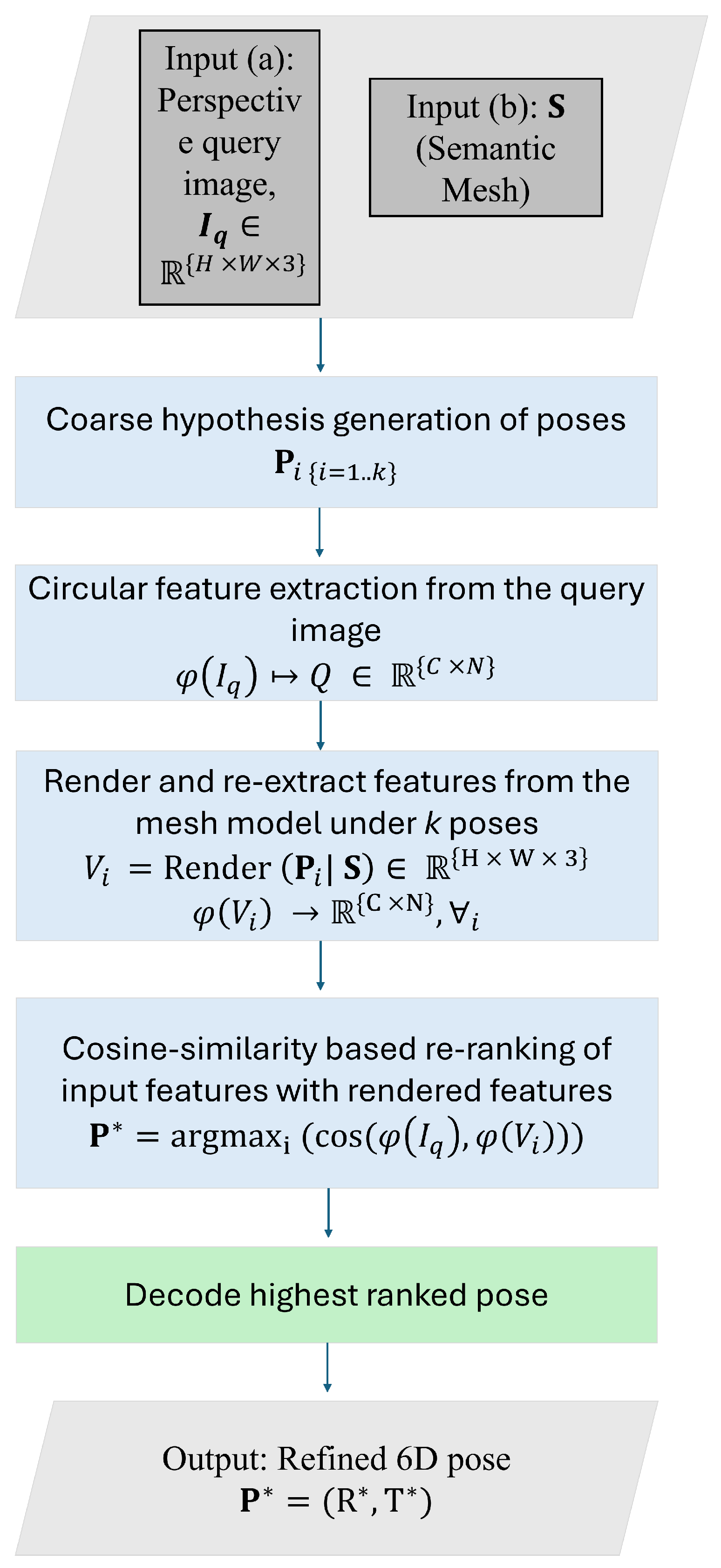 - Phase 1—Retrieval as the PriorWe first use semantic mesh segmentation and viewport matching to rapidly narrow the search space from potentially thousands of poses to a small, high-recall set . The retrieval scores assigned to these candidates are proportional to and thus act as an empirical prior. To construct the empirical prior , the retrieval correlation scores are passed through a softmax, which provides a monotonic and normalized mapping from raw similarity values to probabilities. Monotonicity ensures that if a candidate pose has a higher retrieval score than another , then its prior probability will also be higher, preserving the ranking produced by the retrieval stage. Normalization is necessary for the Bayesian update in Equation (5), where this probability-weighted prior is combined with the descriptor-based likelihood to form the final posterior.