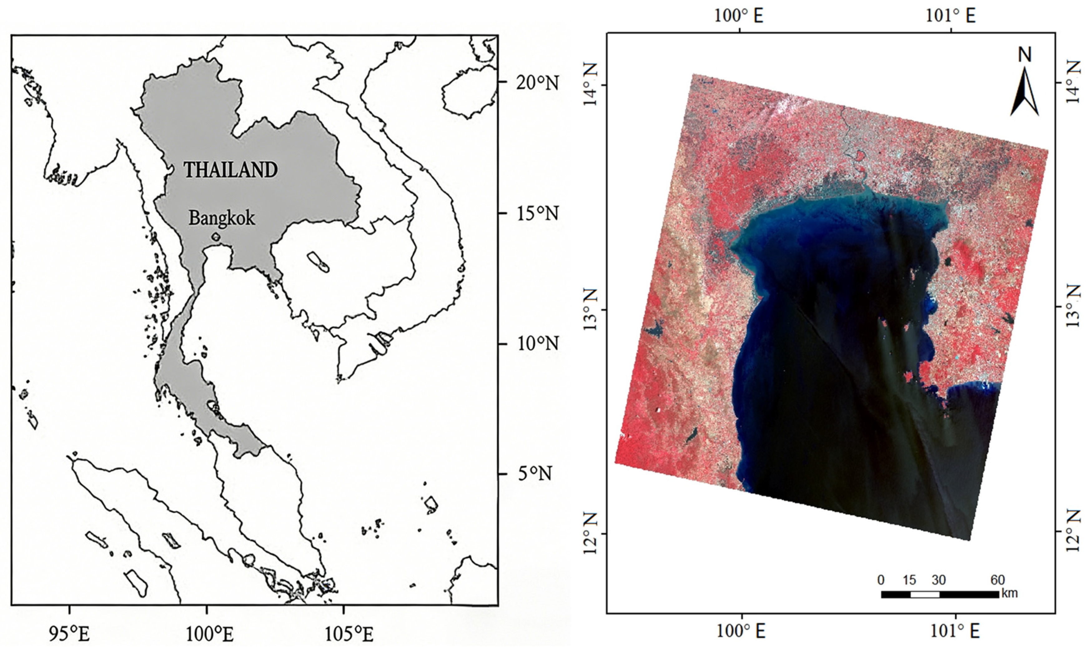 Bangkok, the capital city of Thailand, is located within the northern Gulf of Thailand. The maritime region south of the metropolitan area is designated as “Bangkok Bay.” This bay serves as the estuary for several rivers in Thailand, including the Chao Phraya, Mampa Gong, Taqin, and Mekelon Rivers. The coastline along the Gulf features diverse shoreline types, such as aquaculture ponds, ports, mangrove forests, and river estuaries, making it a region of significant coastal use and change in Thailand.