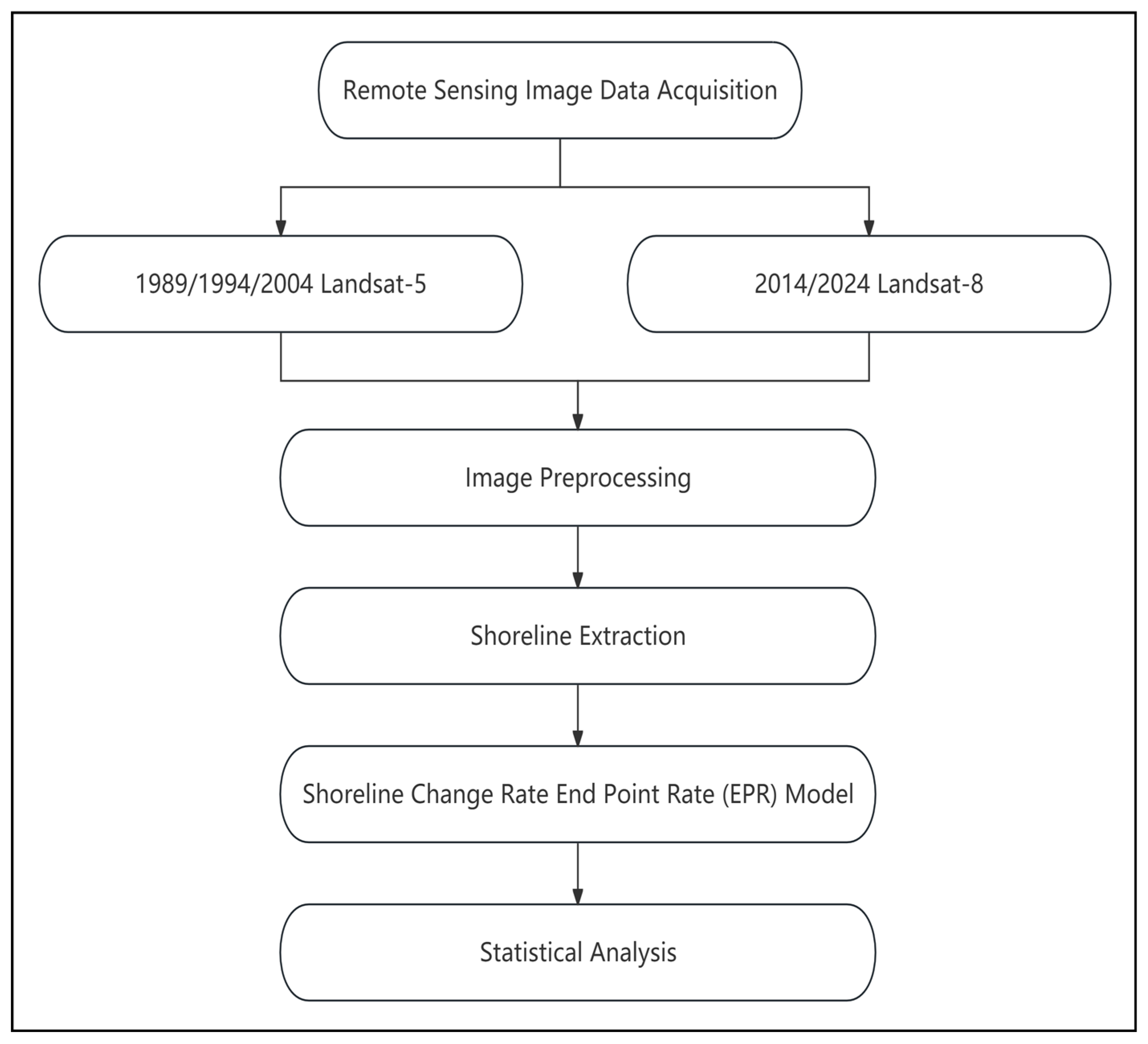 Table 1) have been utilized for the study area in 1989, 1994, 2004, 2014, and 2024, with a spatial resolution of 30 m and an acquisition interval of 5–10 years. To highlight the water-land boundary lines, a pseudo-color synthesis method was adopted. Specifically, the near-infrared, red, and green spectral bands were, respectively, assigned the colors red (R), green (G), and blue (B), and a pseudo-color synthesis was performed. Additionally, appropriate linear stretching was applied to enhance the visibility of the water-land boundaries. The Bangkok Bay shoreline change analysis study has followed the methodology workflow shown in