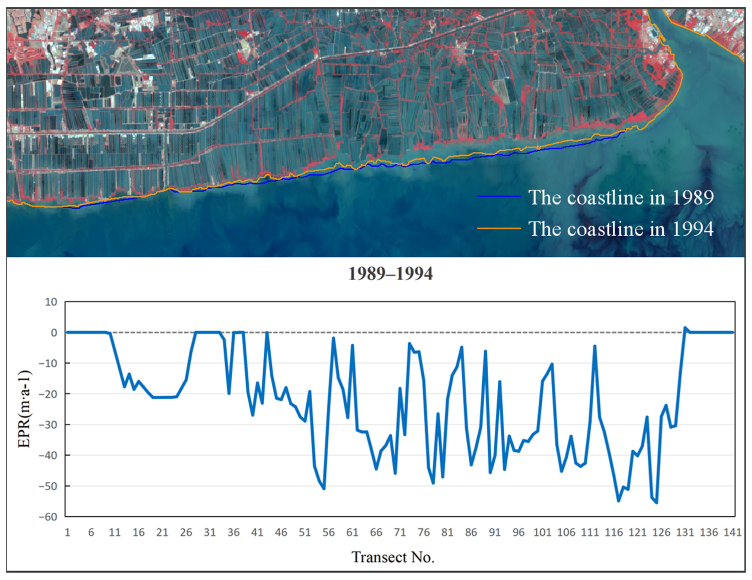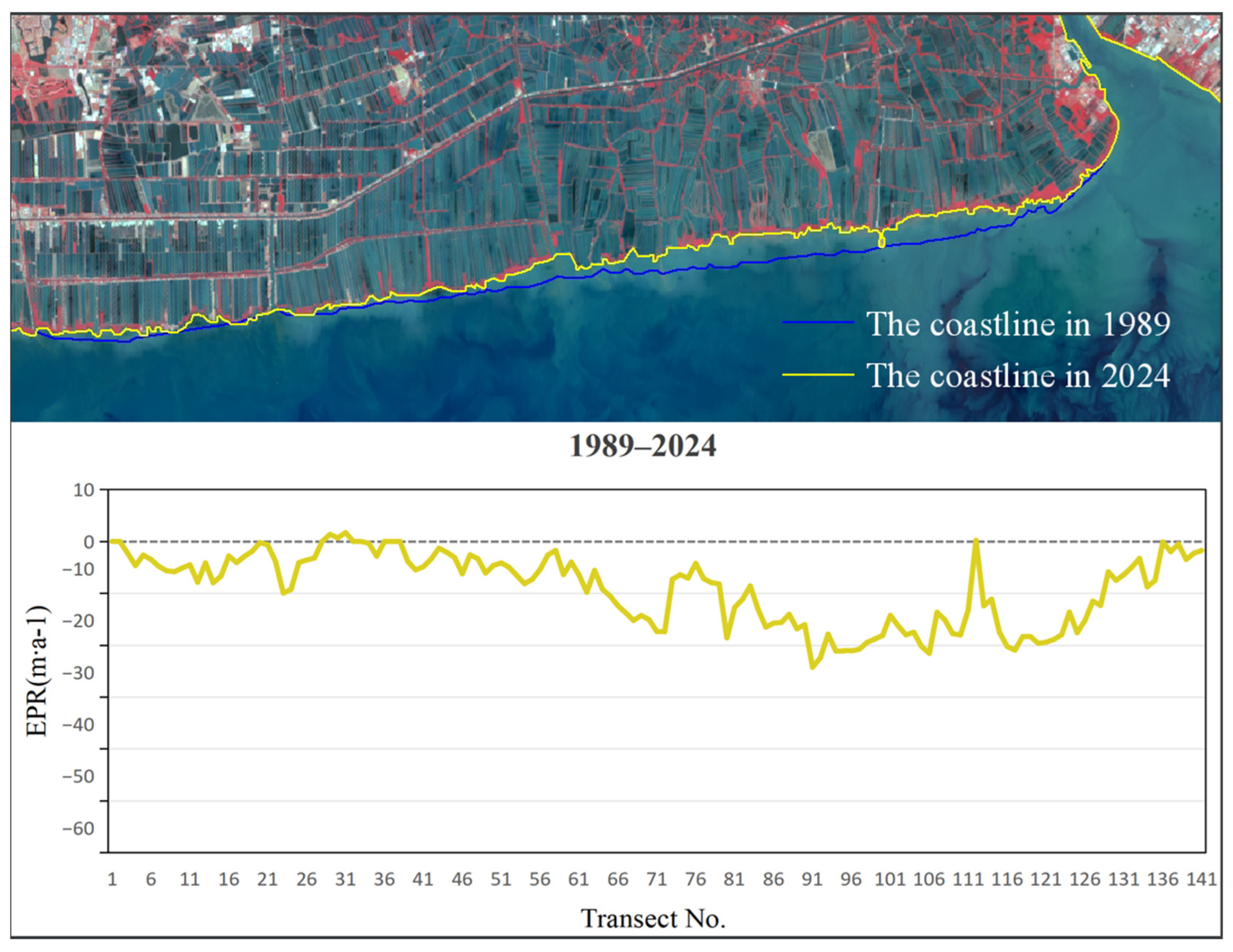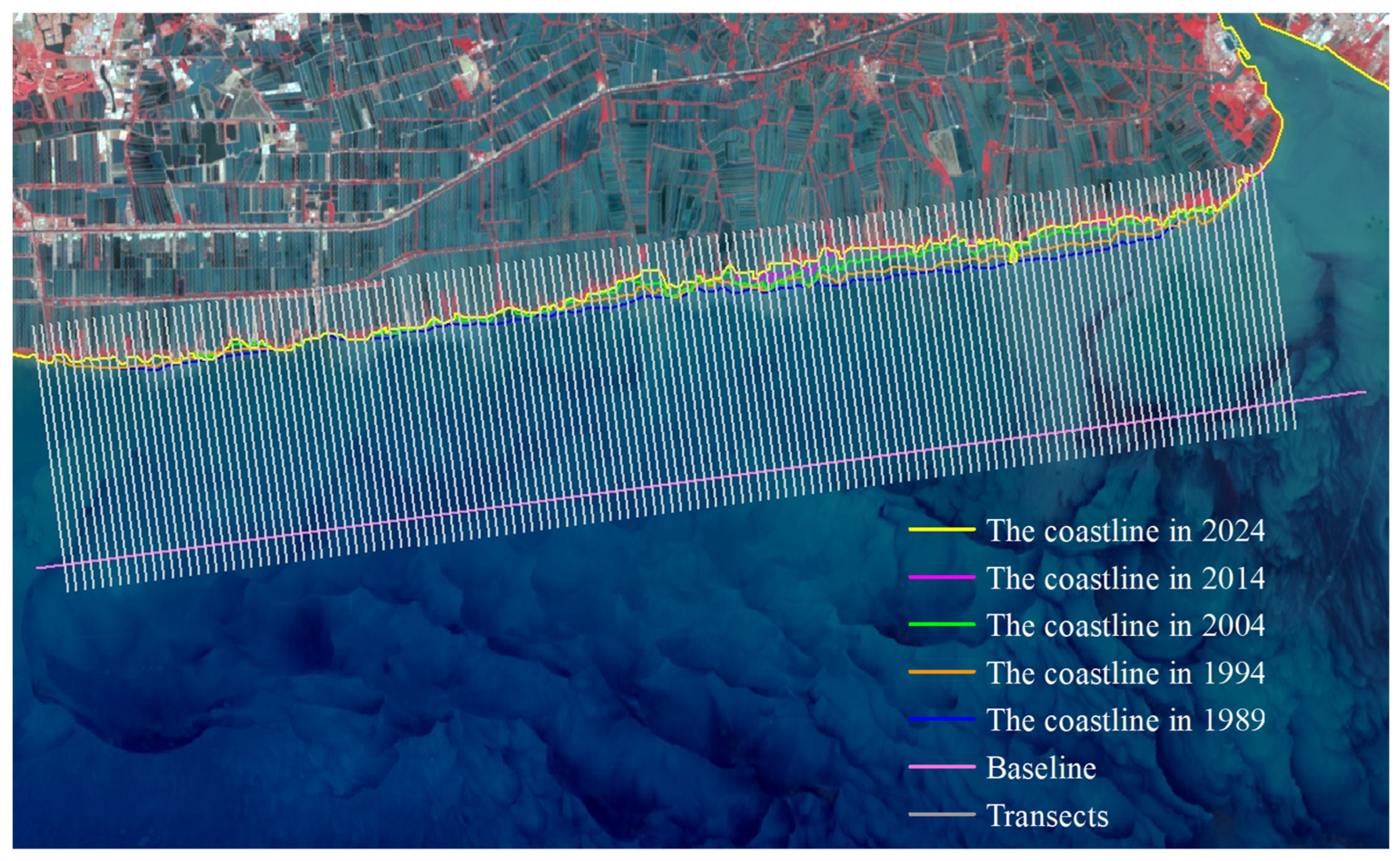 Figure 5). Remote sensing images were interpreted using a human–computer interactive method to extract coastline data for five distinct periods. The calculation of End Point Rate (EPR) values across all specified time intervals was conducted using uniformly spaced (200 m) transect lines set normal to the baseline (
