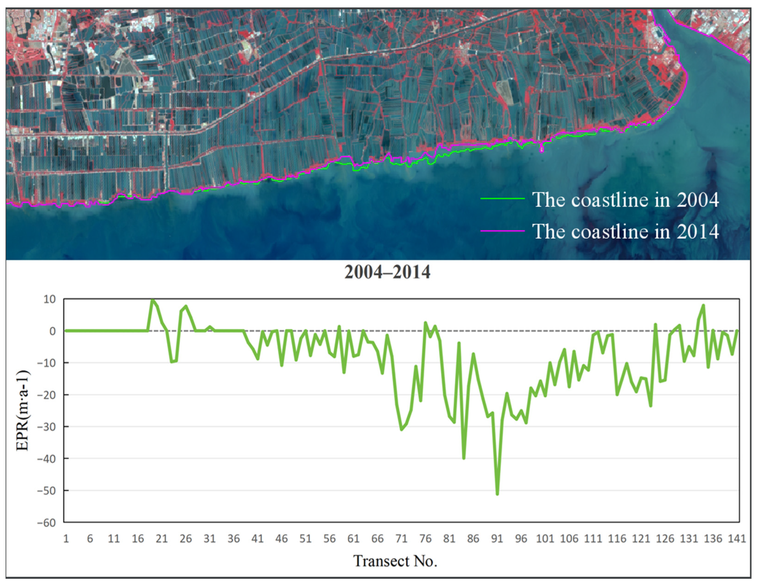 Figure 8), the average EPR decreased to −12.09 m/a, and the maximum erosion rate of −40.92 m/a was identified near section No. 103. The highest deposition rate of 5.82 m/a occurred near section No. 21. During 2004 to 2014 (