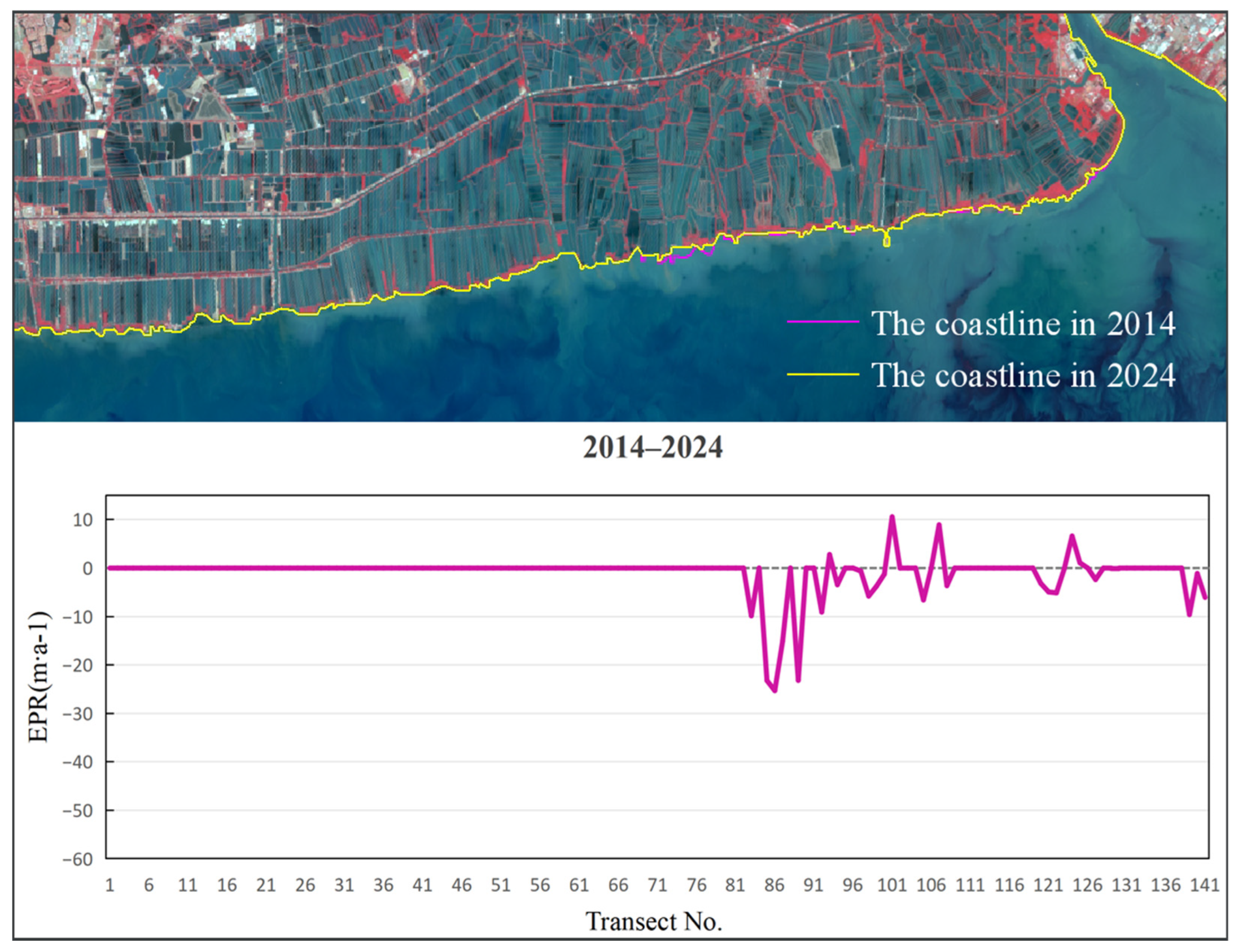 Figure 9), the average EPR was −7.75 m/a, with the maximum erosion rate of −51.15 m/a near section No. 91, and the highest deposition rate of 9.86 m/a near section No. 19. From 2014 to 2024 (