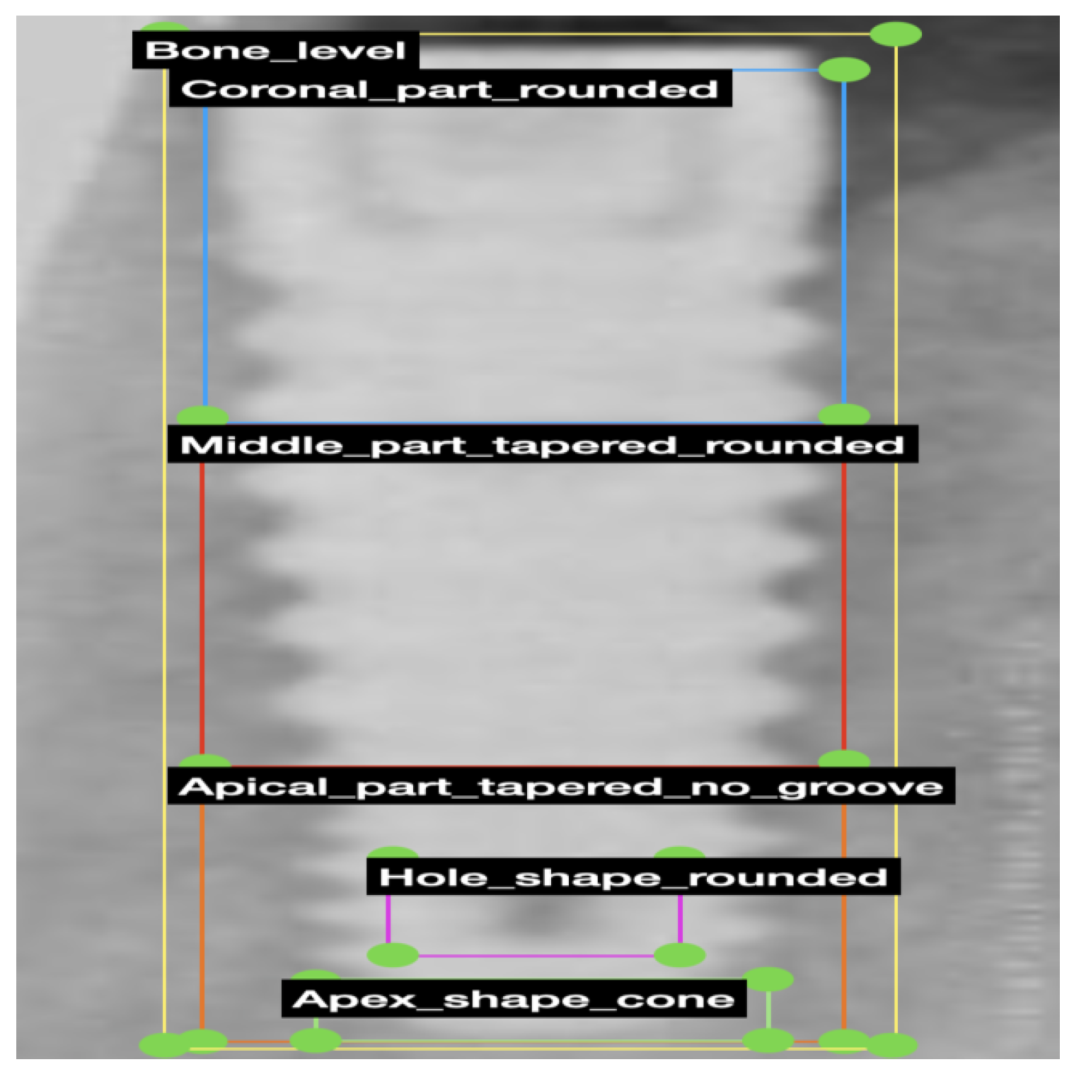 - Handling Missing Implant Parts by developing post-processing strategies to infer or estimate missing parts based on the detected components. We implement techniques such as predictive models [32], spline interpolation [33], and adaptive thresholds [34] to enhance robustness in the presence of incomplete information.