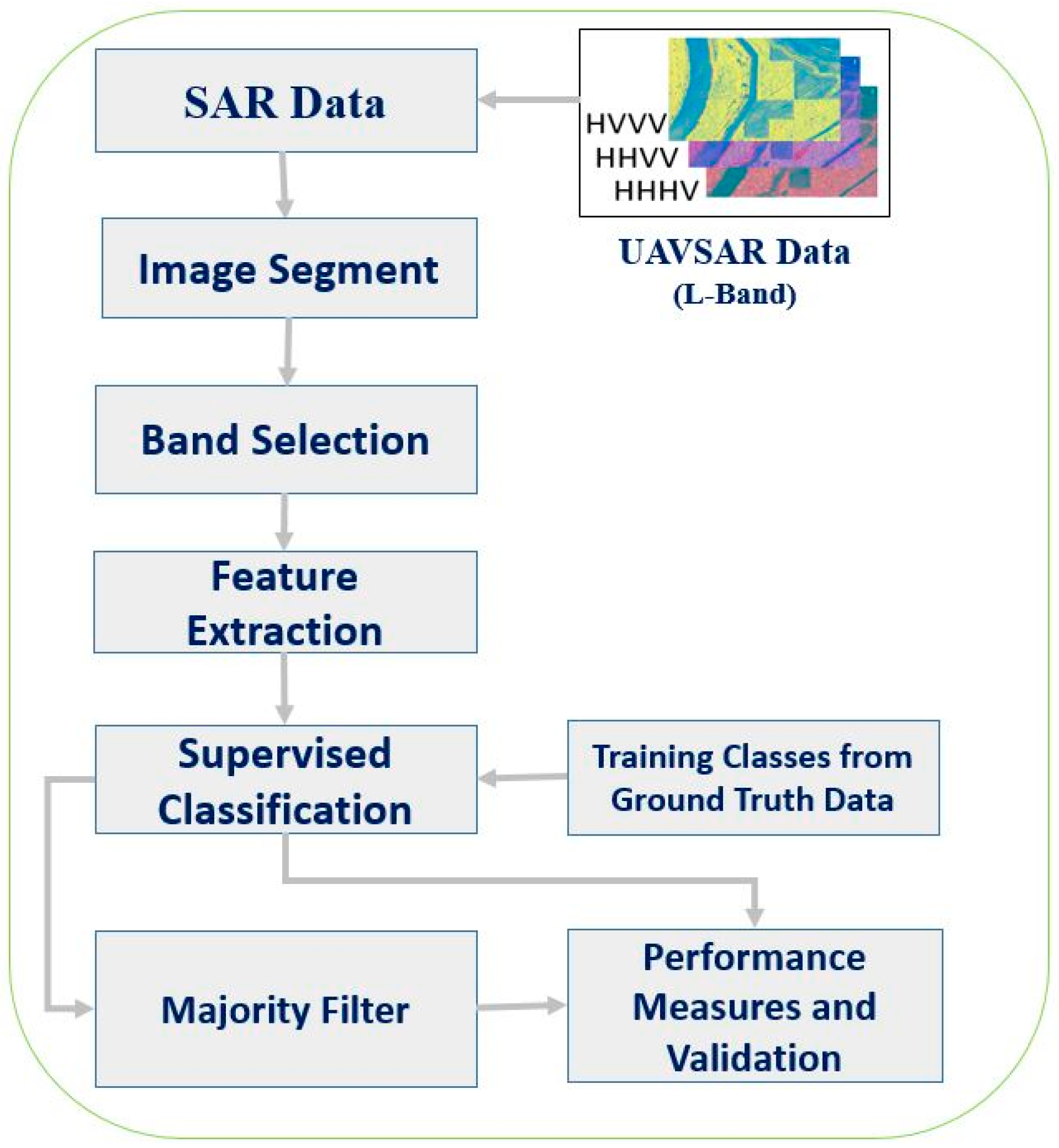 The presented method consists of image segmentation of the levee area, training the classifier, testing the area of interest, and validating the results using ground truth data. The classification algorithm adopted here is a supervised Mahalanobis distance classification for the identification of anomalies such as slough or slump slides on the levee. These slides are slope failures along a levee, which leave areas of the levee vulnerable to seepage and failure during high water events. Majority post-classification filtering uses a moving window (kernel) where each central pixel is assigned to the majority class of the pixels within the window. This filter is applied to a classification image to change isolated pixels within a large single class to the dominant class. The classification is performed using the magnitude, phase, and complex data of the Multi-Look Cross products (MLC) of the UAVSAR acquired. The MLC data is derived from an average of 3 pixels in range and 12 pixels in azimuth of the single look complex data (SLC) pixel [13]. Three complex data bands HHHV, HHVV, and HVVV back scatter magnitudes are used as features for the classification. The portion of the levee from the center line to its river side toe is segmented for analysis. The probabilities of occurrence of slides are greater on the river side. The supervised classification method is trained with two training classes: slide (anomalous) and nonslide (healthy) areas. We used ground truth reference data to train and test the classification algorithms. A majority filter is applied to the classifier output to further improve the accuracy of the classification. Finally, the overall, slide, and nonslide accuracies are computed using the confusion matrix. These processing steps for levee slide detection are illustrated in Figure 1.