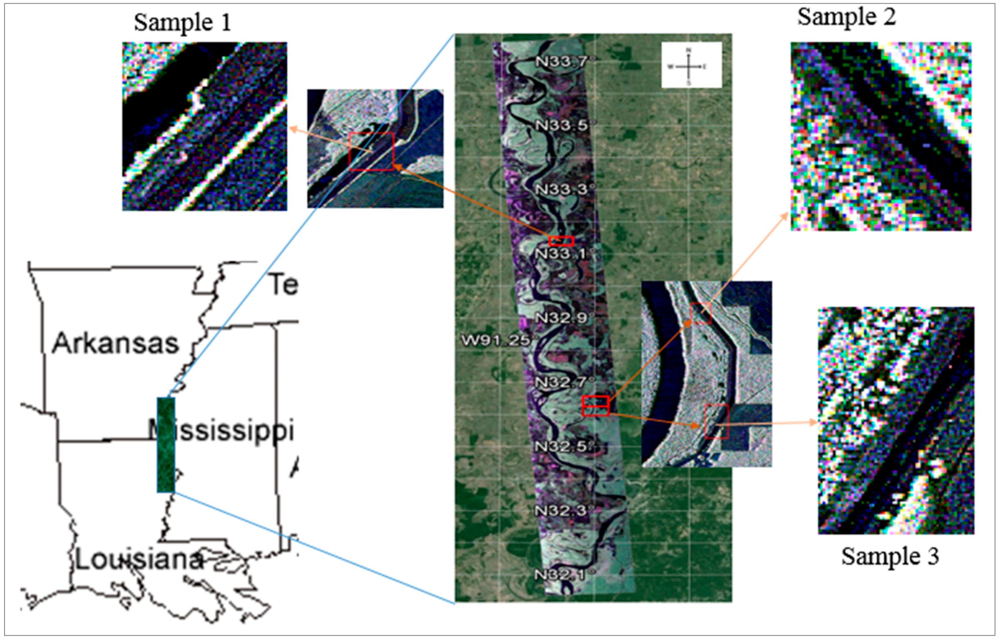 The study area for this work focuses on the mainline levee system of the Mississippi River along the eastern side of the river in Mississippi, USA. This study used airborne L-band polSAR data acquired by NASA JPL’s UAVSAR instrument. The L-band radar is capable of penetrating dry soil to a few centimeters depth. Thus, it is valuable in detecting changes in levees that are key inputs to a levee condition classification system [13]. The UAVSAR data set consists of the three sets of co-polarized channels HHHH, HVHV, and VVVV multi-look cross products (MLC) for the magnitude data classification. In addition, three sets of cross-polarized channels HHHV, HHVV, and HVVV MLC are used to get the individual polarization channel magnitude and phase data, and also for the complex data classification.