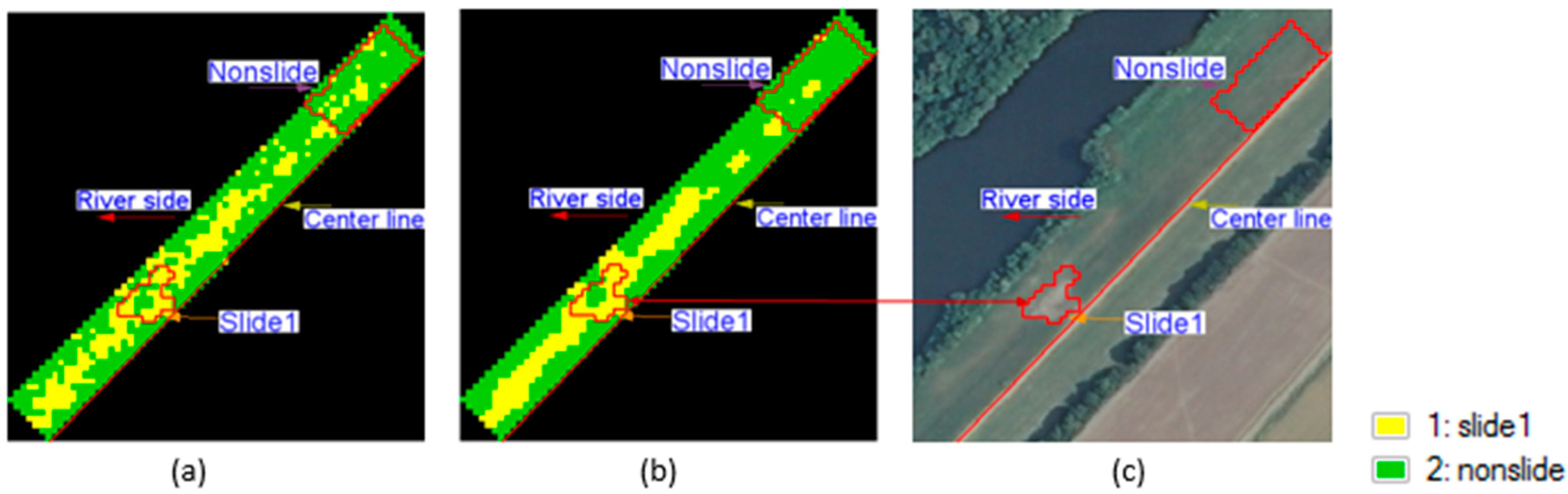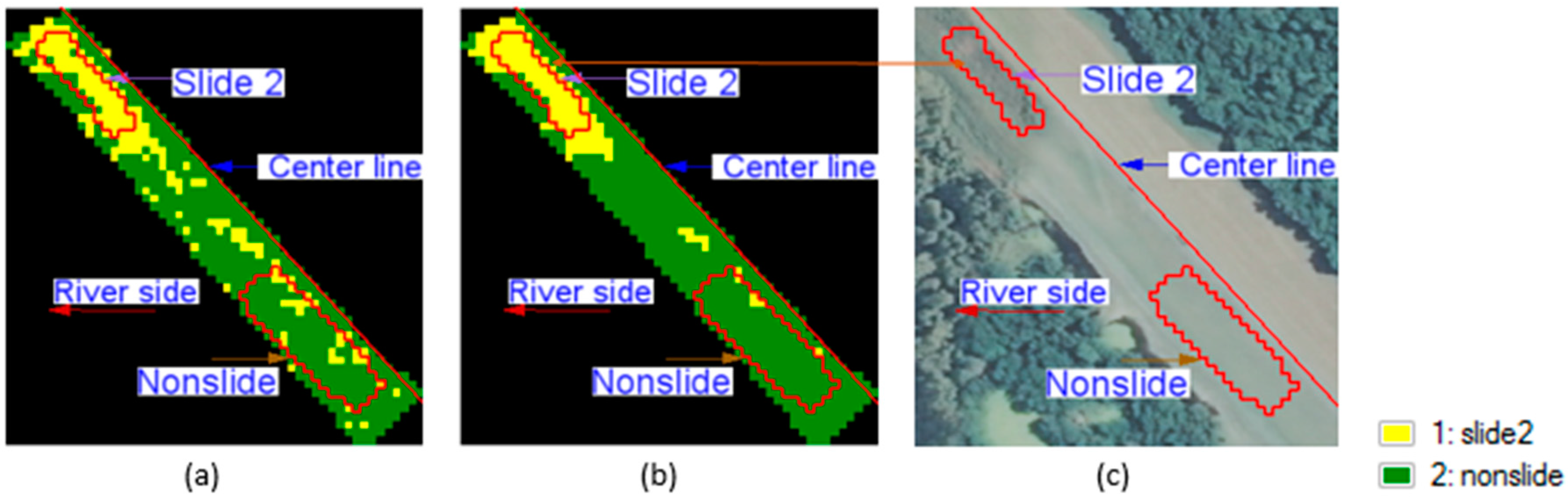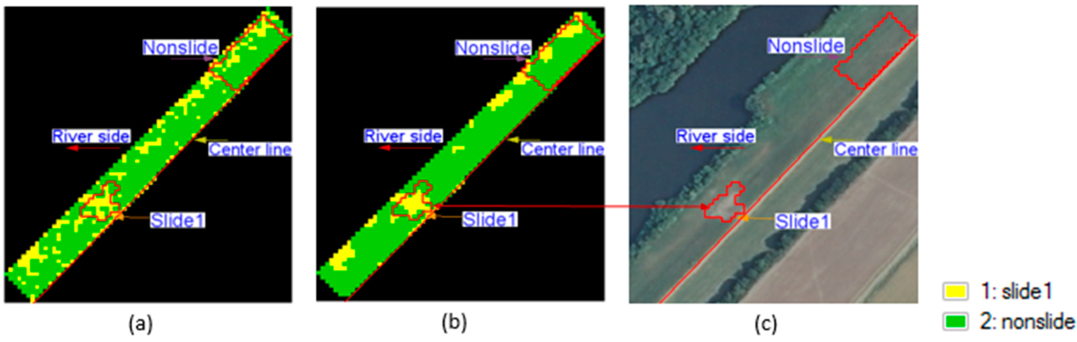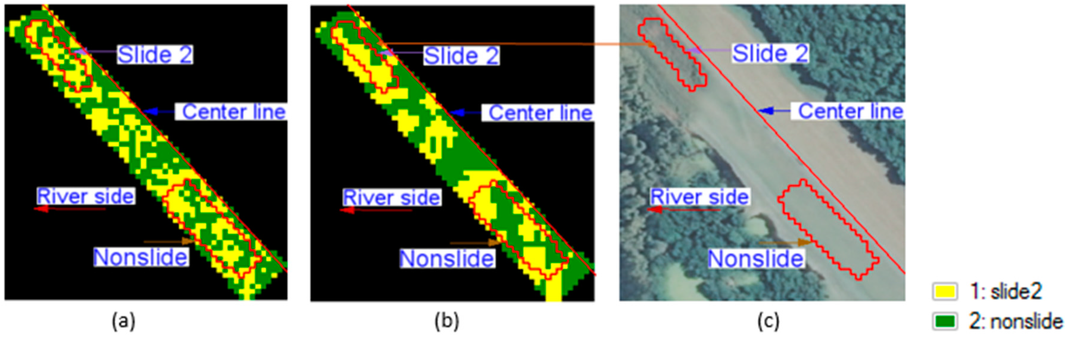Complex data classification for the segment Sample 2: (a) without majority filter; (b) with majority filter; (c) optical image overlaid with slide and nonslide class shapes.