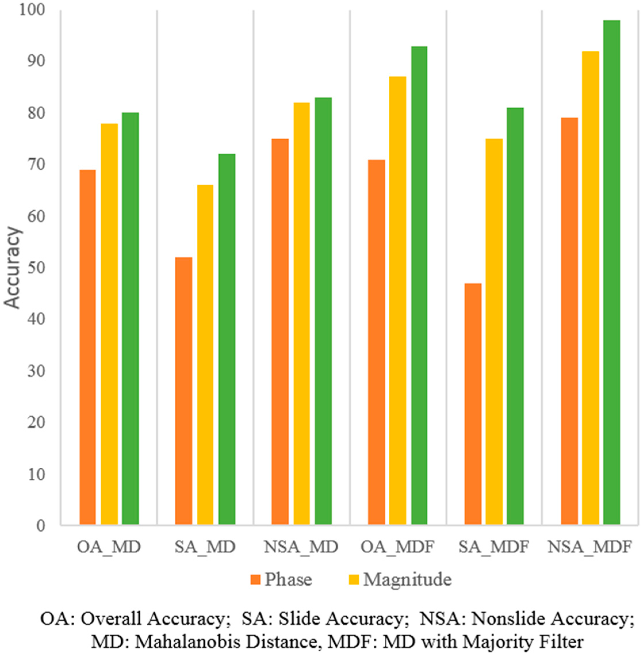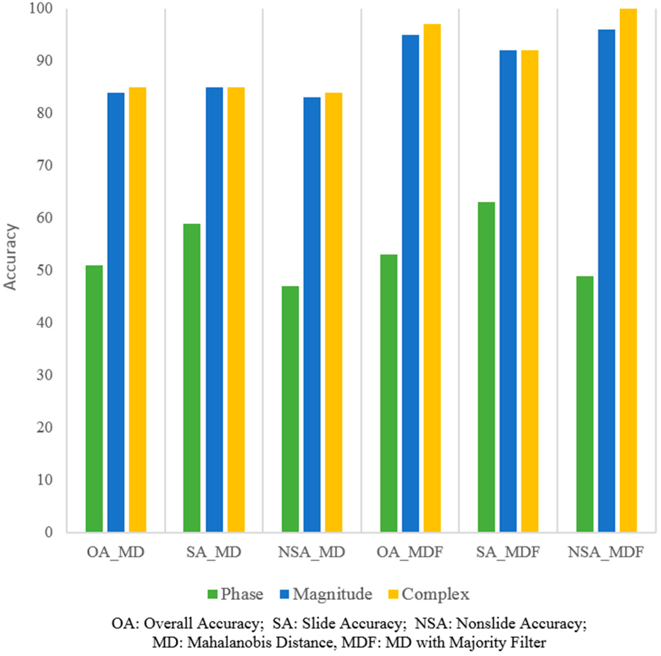 Accuracy comparison of the Mahalanobis distance (MD) classification and with majority filter (MDF), of the segment Sample 3, for the phase, magnitude, and complex data.